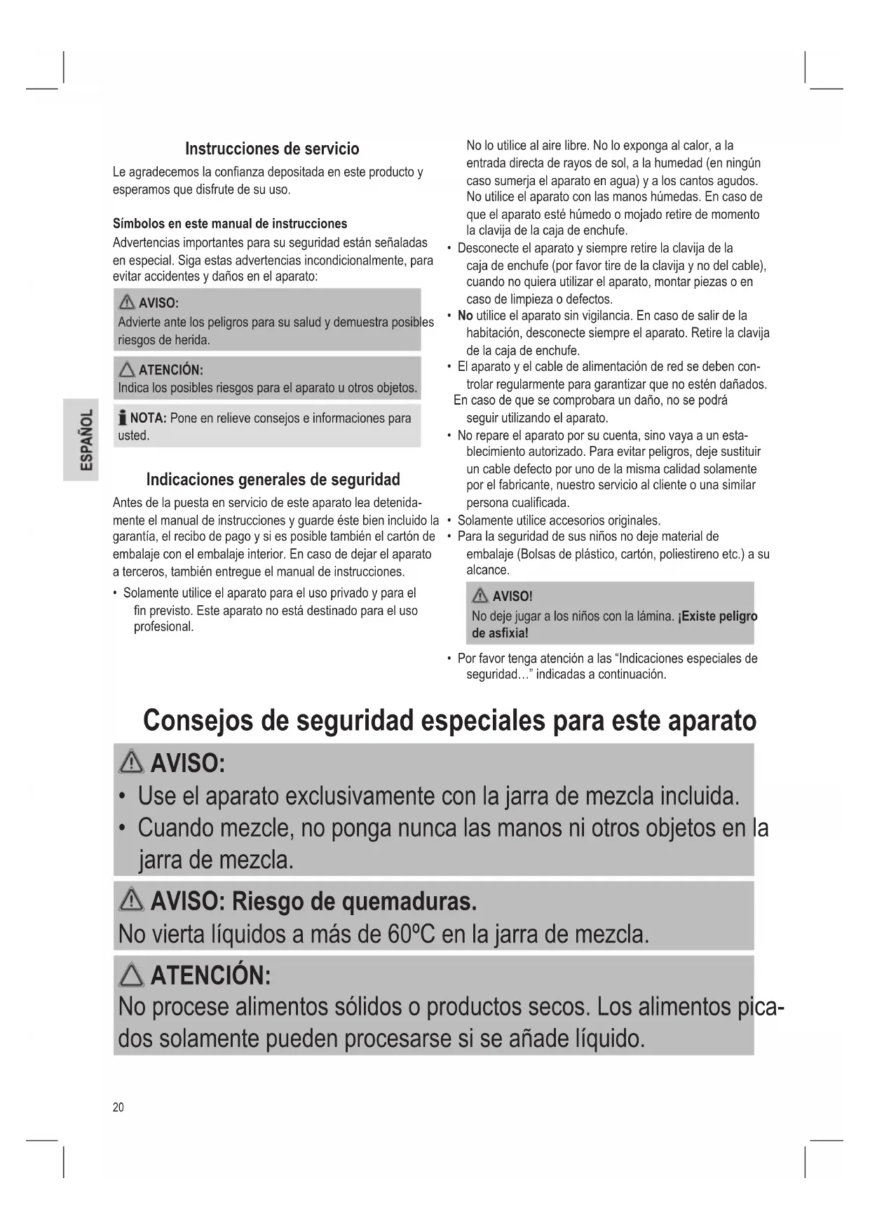 - Cuando mezcle, no ponga nunca las manos ni otros objetos en la jarra de mezcla. AVISO: Riesgo de quemaduras. No vierta líquidos a más de 60ºC en la jarra de mezcla. ATENCIÓN: No procese alimentos sólidos o productos secos. Los alimentos pica- dos solamente pueden procesarse si se añade líquido.21