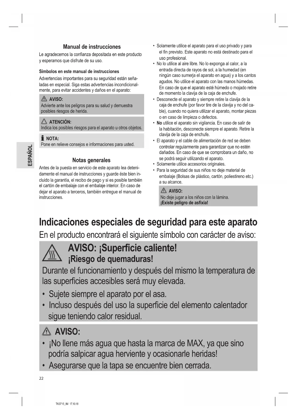 - Para la seguridad de sus niños no deje material de embalaje (Bolsas de plástico, cartón, poliestireno etc.) a su alcance. AVISO: No deje jugar a los niños con la lámina. ¡Existe peligro de asxia! Indicaciones especiales de seguridad para este aparato En el producto encontrará el siguiente símbolo con carácter de aviso: AVISO: ¡Supercie caliente! ¡Riesgo de quemaduras! Durante el funcionamiento y después del mismo la temperatura de las supercies accesibles será muy elevada.