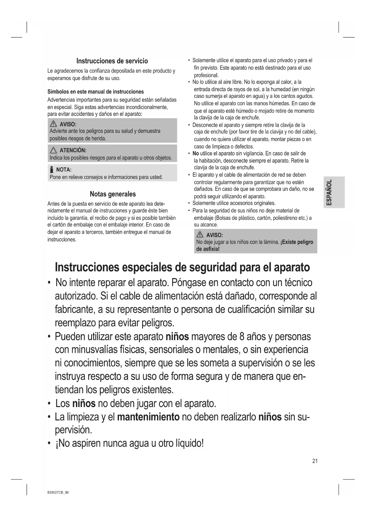 - ¡No aspiren nunca agua u otro líquido!22 BS9027CB_IM 08.03.16