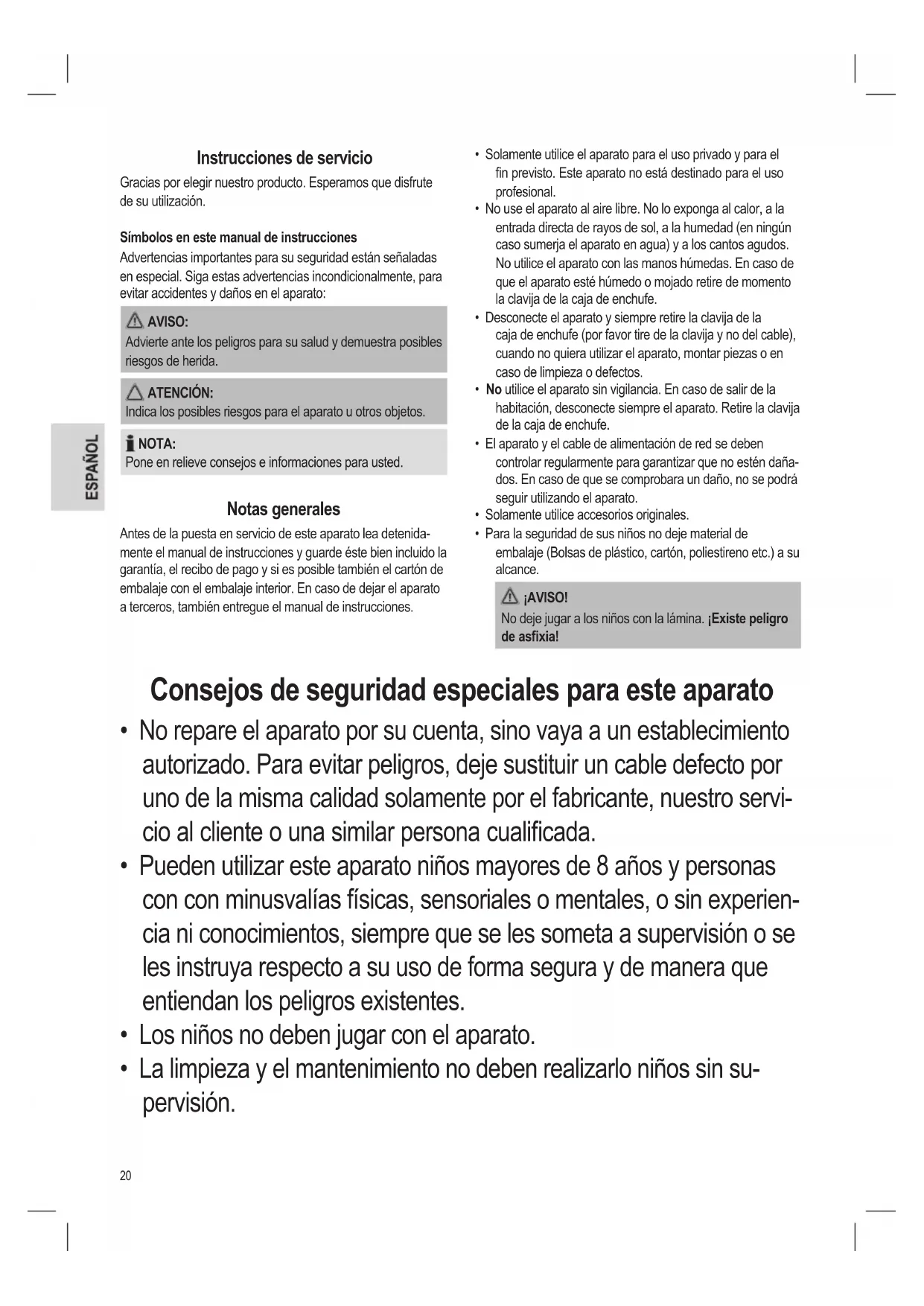- Para la seguridad de sus niños no deje material de embalaje (Bolsas de plástico, cartón, poliestireno etc.) a su alcance. ¡AVISO! No deje jugar a los niños con la lámina. ¡Existe peligro de asxia! Instrucciones de servicio Gracias por elegir nuestro producto. Esperamos que disfrute de su utilización. Símbolos en este manual de instrucciones Advertencias importantes para su seguridad están señaladas en especial. Siga estas advertencias incondicionalmente, para evitar accidentes y daños en el aparato: AVISO: Advierte ante los peligros para su salud y demuestra posibles riesgos de herida. ATENCIÓN: Indica los posibles riesgos para el aparato u otros objetos. NOTA: Pone en relieve consejos e informaciones para usted. Notas generales Antes de la puesta en servicio de este aparato lea detenida- mente el manual de instrucciones y guarde éste bien incluido la garantía, el recibo de pago y si es posible también el cartón de embalaje con el embalaje interior. En caso de dejar el aparato a terceros, también entregue el manual de instrucciones. Consejos de seguridad especiales para este aparato
