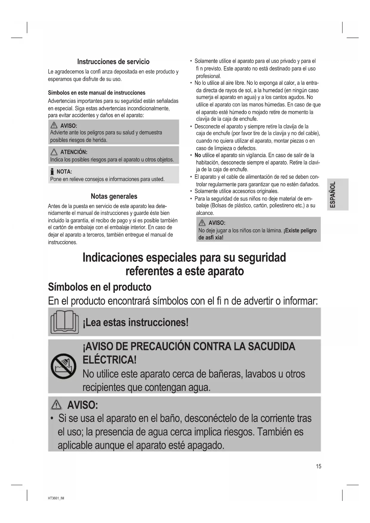 - Si se usa el aparato en el baño, desconéctelo de la corriente tras el uso; la presencia de agua cerca implica riesgos. También es aplicable aunque el aparato esté apagado.16 HT3661_IM 07.07.16 AVISO: