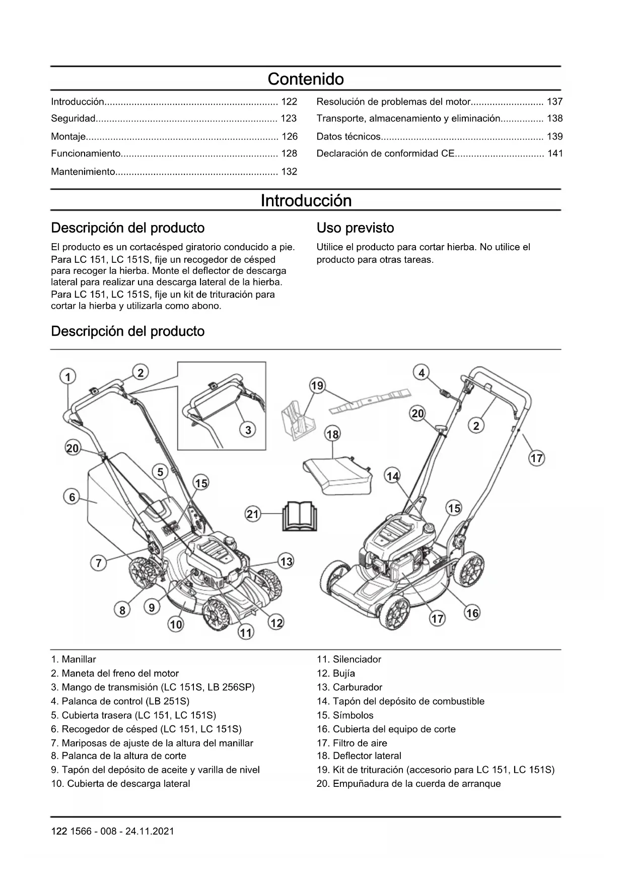 122 1566 - 008 - 24.11.202121. Manual de usuario Símbolos que aparecen en el producto ¡ADVERTENCIA! Tenga cuidado y utilice el producto correctamente. Este producto puede ocasionar lesiones graves o mortales tanto al operador como a cualquier otra persona. Lea detenidamente el manual de usuario y asegúrese de que entiende las instrucciones antes de usar la máquina. Tenga cuidado con los objetos lanzados o rebotados. Mantenga a las personas y animales a una distancia de seguridad respecto a la zona de trabajo. Advertencia: Mantenga alejados las manos y los pies de la cuchilla giratoria. Advertencia: Mantenga alejados las manos y los pies de las piezas giratorias. Detenga el motor y quite el cable de encendido antes de realizar tareas de mantenimiento o reparación. Este producto cumple con las directivas CE vigentes. Las emisiones sonoras en el entorno según la directiva de la Comunidad Europea. Las emisiones del producto se indican en el capítulo «Datos técnicos» y en la etiqueta. Riesgo de incendio. No inhale los gases de escape. Los gases de escape del motor contienen monóxido de carbono, que es un gas inodoro, tóxico y muy peligroso. No arranque el motor en interiores ni en espacios cerrados. Superficie caliente. Llene el motor de aceite an- tes de arrancar el producto. Nota: Los demás símbolos/etiquetas que aparecen en el producto corresponden a requisitos de homologación específicos de algunas zonas comerciales. Responsabilidad sobre el producto Como se estipula en las leyes de responsabilidad del producto, no nos hacemos responsables de los daños y perjuicios causados por nuestro producto si: