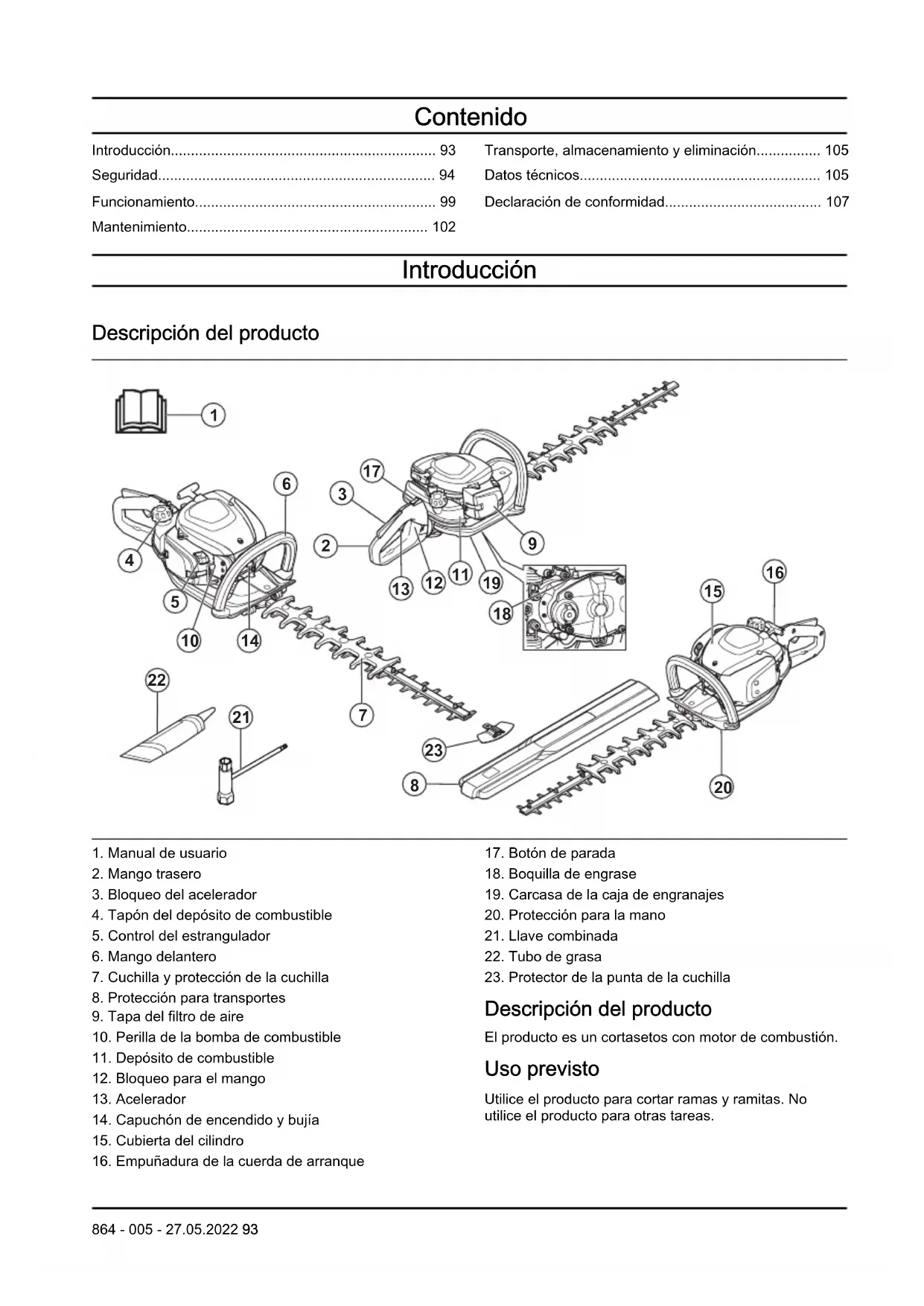 Descripción del producto El producto es un cortasetos con motor de combustión. Uso previsto Utilice el producto para cortar ramas y ramitas. No utilice el producto para otras tareas.