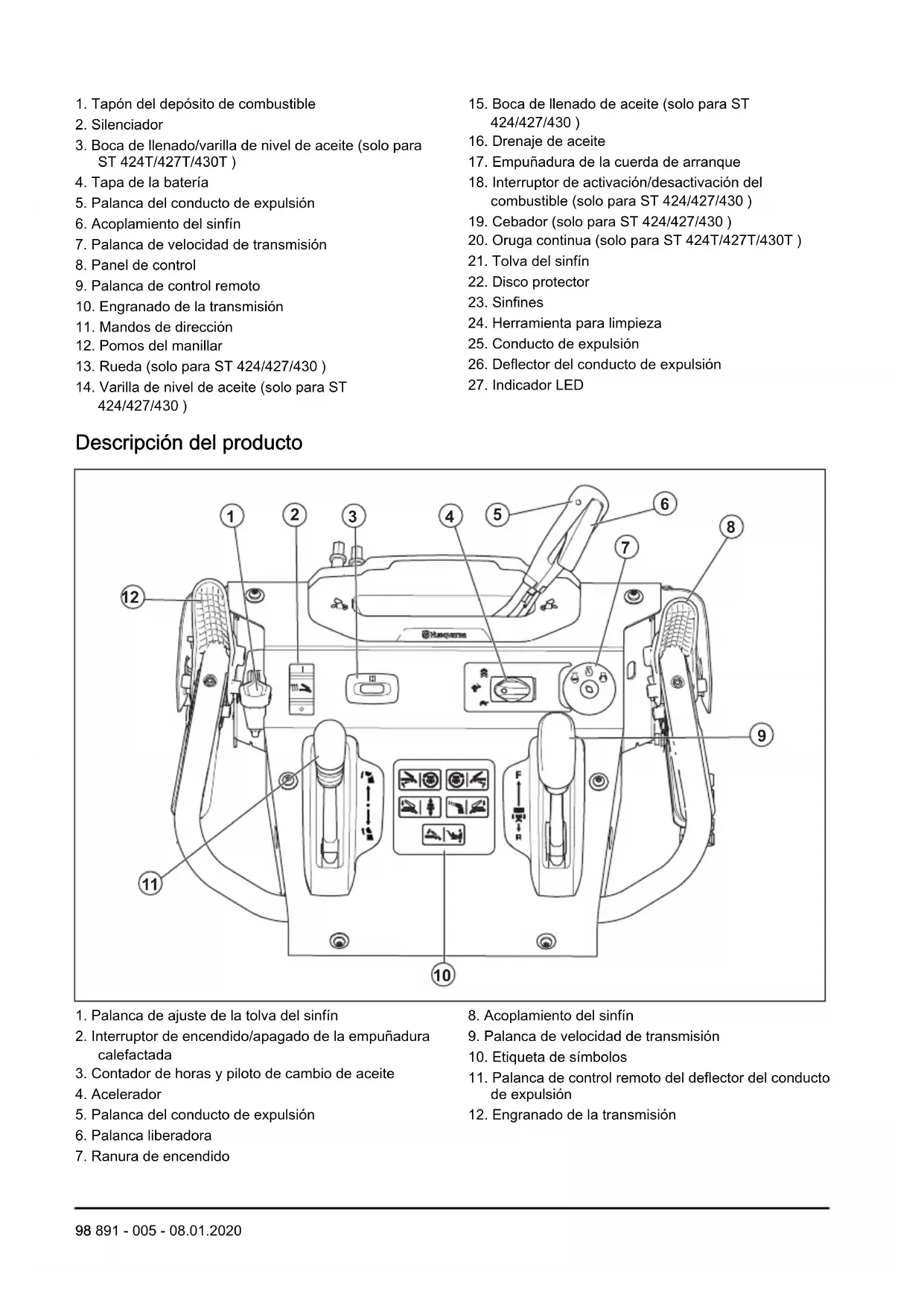98 891 - 005 - 08.01.2020Descripción del producto Este producto es un quitanieves que se utiliza para retirar la nieve del suelo. Uso previsto Este producto puede utilizarse para retirar la nieve de campos, carreteras, caminos y vías de acceso. No lo use en pendientes superiores a 20°. No utilice el producto en zonas donde haya muchos residuos, suciedad y piedras prominentes. Símbolos que aparecen en el producto Nota: Si las etiquetas del producto están dañadas, póngase en contacto con el distribuidor para sustituirlas. Advertencia. Lea el manual de instrucciones. Encendido. Arranque el motor. STOP Motor apagado. Sobrealimentación (Boost). Rápido. Lento. Piloto de cambio de aceite. Calefacción de los mangos. Quite la llave antes de realizar cualquier operación de mantenimiento. Superficie caliente. Riesgo de incendio. Tenga cuidado con los objetos que puedan salir despedidos. Mantenga alejados a los transeúntes. No inhale los gases de escape. Desplácese lentamente cuando vaya marcha atrás. Riesgo de caída. Gire a la izquierda. Gire a la derecha. Quitanieves. Cambie la altura de la tol- va del sinfín. Responsabilidad sobre el producto Como se estipula en las leyes de responsabilidad del producto, no nos hacemos responsables de los daños y perjuicios causados por nuestro producto si:
