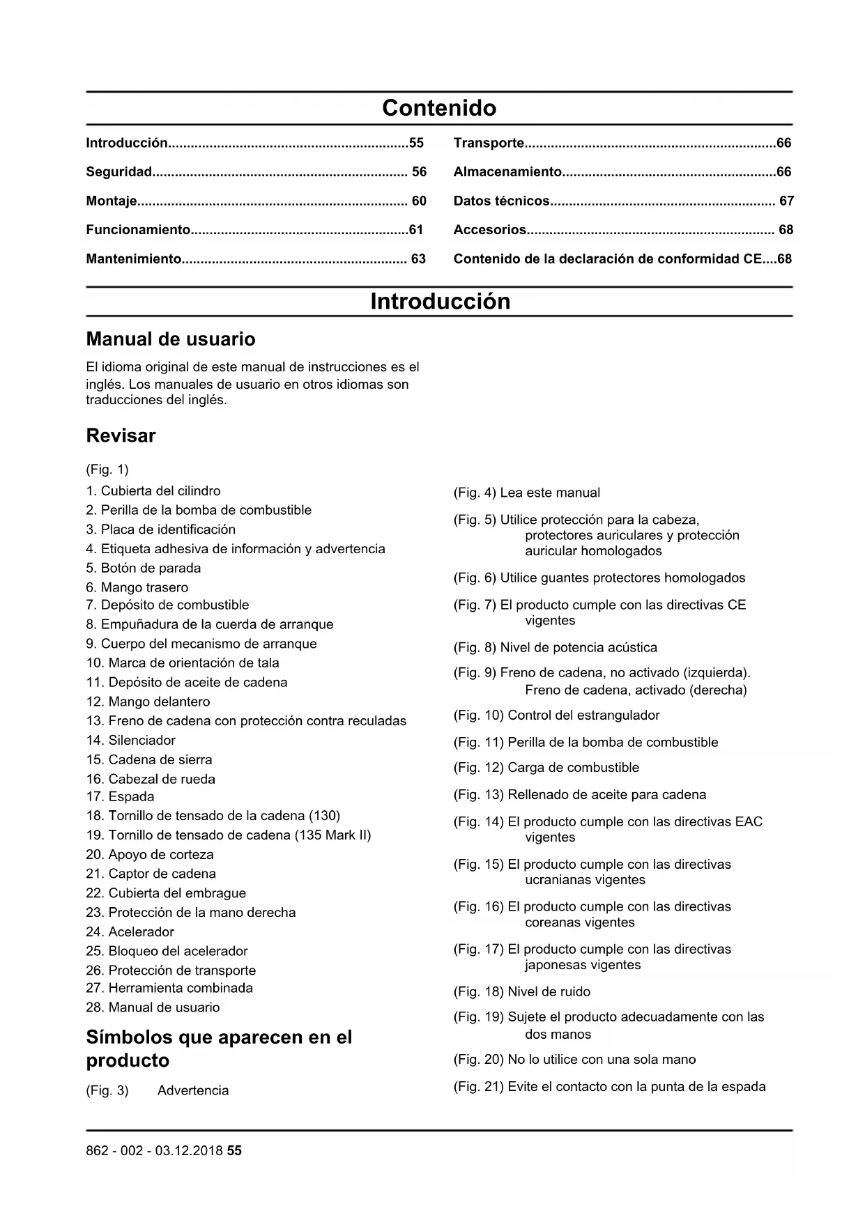 Símbolos que aparecen en el producto (Fig. 3) Advertencia (Fig. 4) Lea este manual (Fig. 5) Utilice protección para la cabeza, protectores auriculares y protección auricular homologados (Fig. 6) Utilice guantes protectores homologados (Fig. 7) El producto cumple con las directivas CE vigentes (Fig. 8) Nivel de potencia acústica (Fig. 9) Freno de cadena, no activado (izquierda). Freno de cadena, activado (derecha) (Fig. 10) Control del estrangulador (Fig. 11) Perilla de la bomba de combustible (Fig. 12) Carga de combustible (Fig. 13) Rellenado de aceite para cadena (Fig. 14) El producto cumple con las directivas EAC vigentes (Fig. 15) El producto cumple con las directivas ucranianas vigentes (Fig. 16) El producto cumple con las directivas coreanas vigentes (Fig. 17) El producto cumple con las directivas japonesas vigentes (Fig. 18) Nivel de ruido (Fig. 19) Sujete el producto adecuadamente con las dos manos (Fig. 20) No lo utilice con una sola mano (Fig. 21) Evite el contacto con la punta de la espada