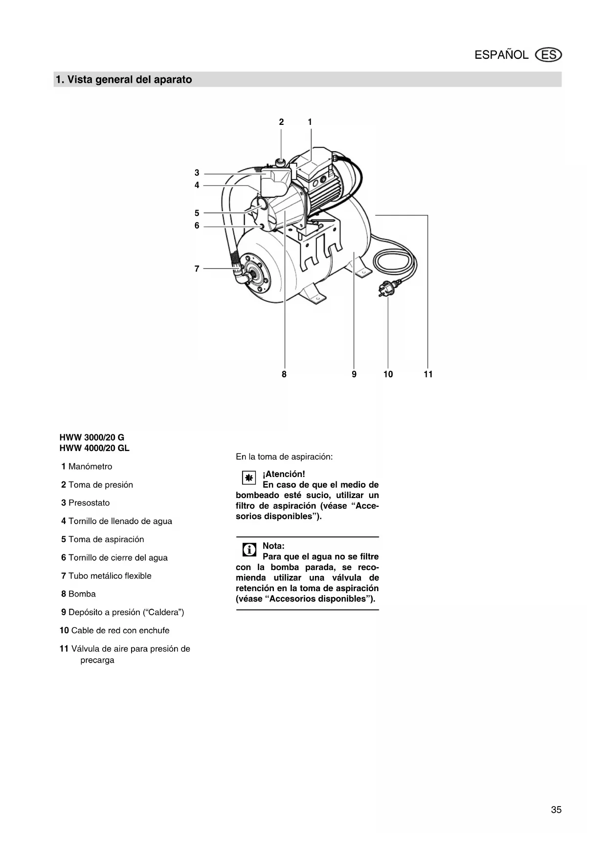 HWW 3000/20 G HWW 4000/20 GL 1 Manómetro 2 Toma de presión 3 Presostato 4 Tornillo de llenado de agua 5 Toma de aspiración 6 Tornillo de cierre del agua 7 Tubo metálico flexible 8 Bomba 9 Depósito a presión (“Caldera”) 10 Cable de red con enchufe 11 Válvula de aire para presión de precarga En la toma de aspiración:
