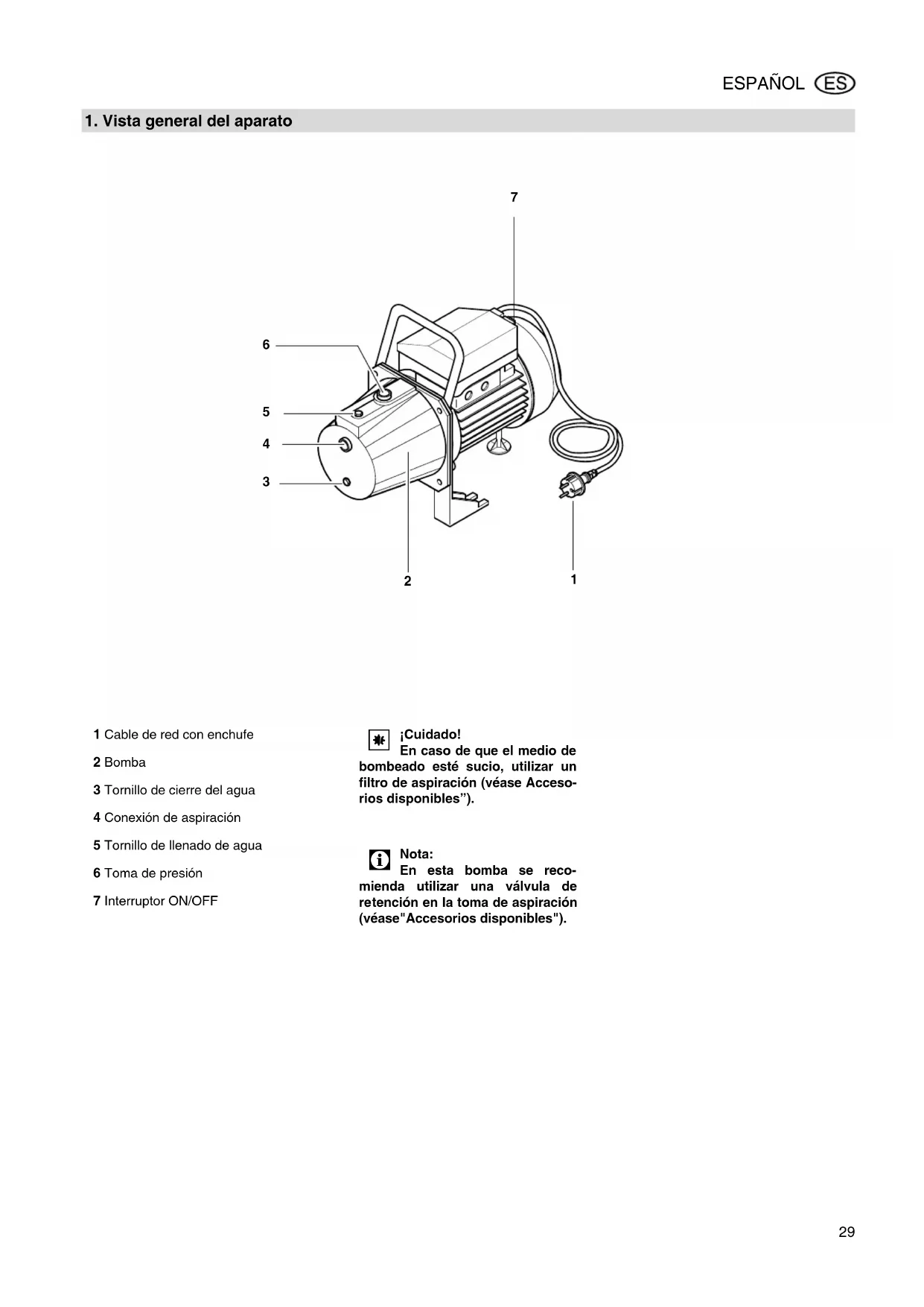 ateriales. Nota: Información adicional. Los números de las ilustraciones (1, 2, 3, ...) indi can piezas individuales; está n numerados sucesiva- mente; y se refieren a los números entre paréntesis (1), (2), (3) ... del texto adjunto. Las instrucciones de uso, en las que debe tenerse en cuenta el orden, también están numeradas. Las instrucciones de uso que no siguen un orden concreto están marcadas con un punto. Los listados están marcados con un guión. Este aparato se usa para bombear agua