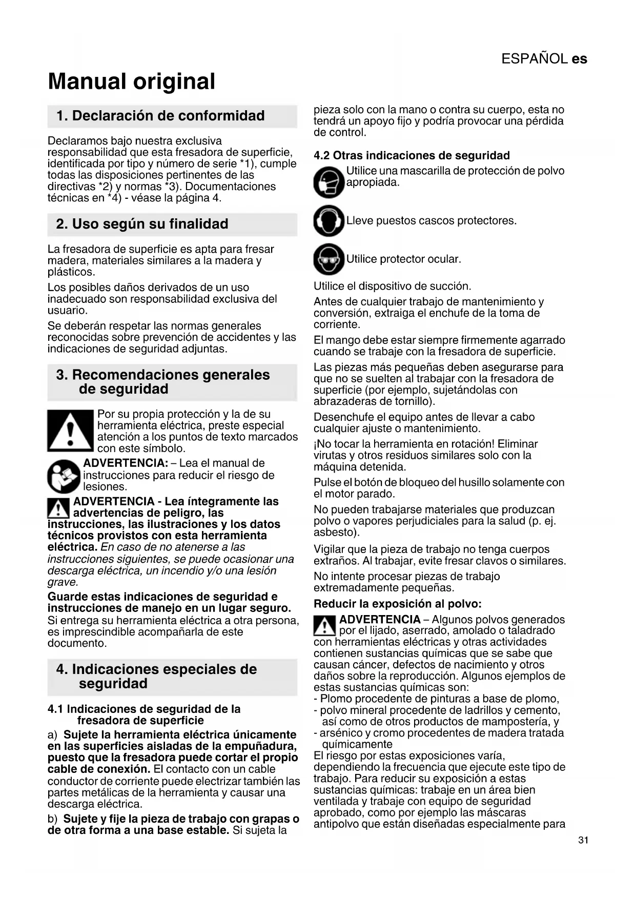Manual original Declaramos bajo nuestra exclusiva responsabilidad que esta fresadora de superficie, identificada por tipo y número de serie *1), cumple todas las disposiciones pertinentes de las directivas *2) y normas *3). Documentaciones técnicas en *4) - véase la página 4. La fresadora de superficie es apta para fresar madera, materiales similares a la madera y plásticos. Los posibles daños derivados de un uso inadecuado son responsabilidad exclusiva del usuario. Se deberán respetar las normas generales reconocidas sobre prevención de accidentes y las indicaciones de seguridad adjuntas. Por su propia protección y la de su herramienta eléctrica, preste especial atención a los puntos de texto marcados con este símbolo. ADVERTENCIA: – Lea el manual de instrucciones para reducir el riesgo de lesiones. ADVERTENCIA - Lea íntegramente las advertencias de peligro, las instrucciones, las ilustraciones y los datos técnicos provistos con esta herramienta eléctrica. En caso de no atenerse a las instrucciones siguientes, se puede ocasionar una descarga eléctrica, un incendio y/o una lesión grave. Guarde estas indicaciones de seguridad e instrucciones de manejo en un lugar seguro. Si entrega su herramienta eléctrica a otra persona, es imprescindible acompañarla de este documento.
