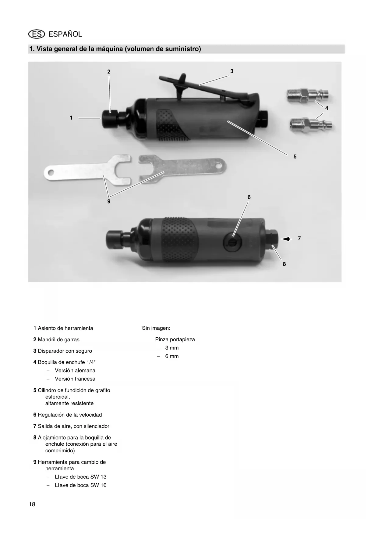 1 Asiento de herramienta 2 Mandril de garras 3 Disparador con seguro 4 Boquilla de enchufe 1/4" Versió n alemana Versió n francesa 5 Cilindro de fundición de grafito esfe roidal, altamente resistente 6 Regulación de la velocidad 7 Salida de aire, con silenciador 8 Alojamiento para la boquilla de enchu fe (conexión para el aire comprimido) 9 Herramienta para cambio de herramienta