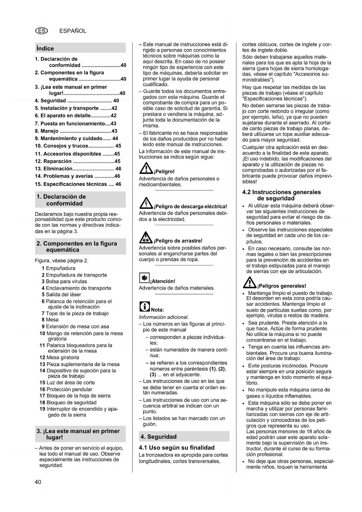 Declaramos bajo nuestra propia res- ponsabilidad que este producto coinci- de con las normas y directivas indica- das en la página 3. Figura, véase página 2. – Antes de poner en servicio el equipo, lea todo el manual de uso. Observe especialmente las instrucciones de seguridad. – Este manual de instrucciones está di- rigido a personas con conocimientos técnicos sobre máquinas como la aquí descrita. En caso de no poseer ningún tipo de experiencia con este tipo de máquinas, debería solicitar en primer lugar la ayuda de personal cualificado. – Guarde todos los documentos entre- gados con esta máquina. Guarde el comprobante de compra para un po
