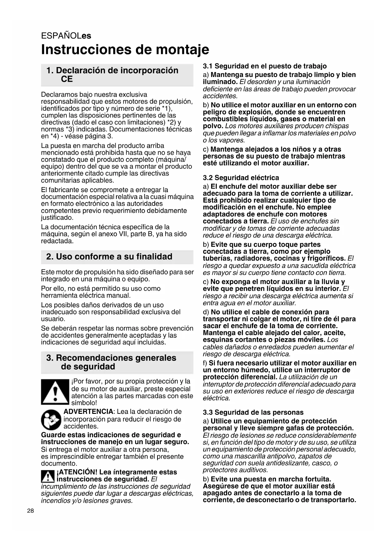 Instrucciones de montaje Declaramos bajo nuestra exclusiva responsabilidad que estos motores de propulsión, identificados por tipo y número de serie *1), cumplen las disposiciones pertinentes de las directivas (dado el caso con limitaciones) *2) y normas *3) indicadas. Documentaciones técnicas en *4) - véase página 3. La puesta en marcha del producto arriba mencionado está prohibida hasta que no se haya constatado que el producto completo (máquina/ equipo) dentro del que se va a montar el producto anteriormente citado cumple las directivas comunitarias aplicables. El fabricante se compromete a entregar la documentación especial relativa a la cuasi máquina en formato electrónico a las autoridades competentes previo requerimiento debidamente justificado. La documentación técnica específica de la máquina, según el anexo VII, parte B, ya ha sido redactada. Este motor de propulsión ha sido diseñado para ser integrado en una máquina o equipo. Por ello, no está permitido su uso como herramienta eléctrica manual. Los posibles daños derivados de un uso inadecuado son responsabilidad exclusiva del usuario. Se deberán respetar las normas sobre prevención de accidentes generalmente aceptadas y las indicaciones de seguridad aquí incluidas. ¡Por favor, por su propia protección y la de su motor de auxiliar, preste especial atención a las partes marcadas con este símbolo! ADVERTENCIA: Lea la declaración de incorporación para reducir el riesgo de accidentes. Guarde estas indicaciones de seguridad e instrucciones de manejo en un lugar seguro. Si entrega el motor auxiliar a otra persona, es imprescindible entregar también el presente documento. ¡ATENCIÓN! Lea íntegramente estas instrucciones de seguridad. El incumplimiento de las instrucciones de seguridad siguientes puede dar lugar a descargas eléctricas, incendios y/o lesiones graves.