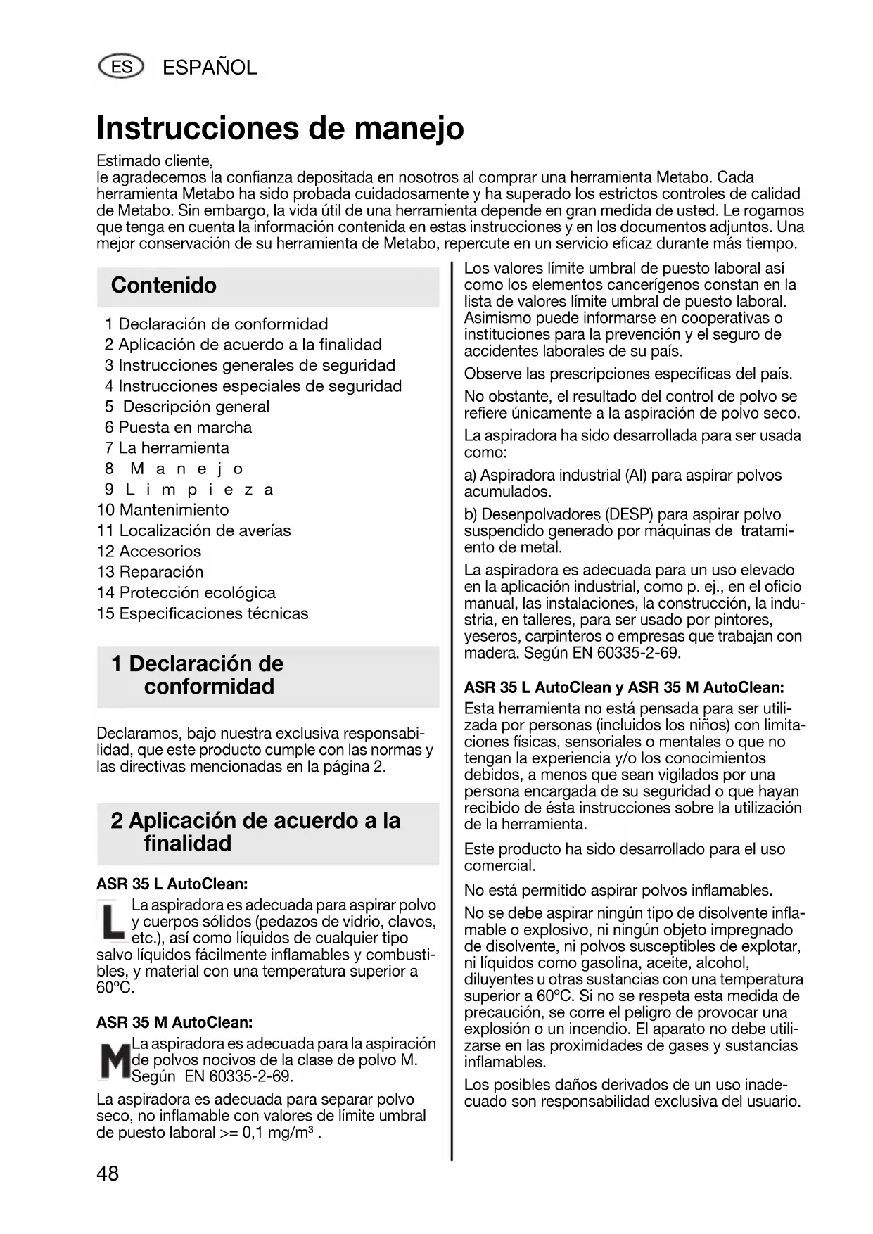 1 Declaración de conformidad 2 Aplicación de acuerdo a la finalidad 3 Instrucciones generales de seguridad 4 Instrucciones especiales de seguridad 5 Descripción general 6 Puesta en marcha 7 La herramienta 8 Manejo 9Limpieza 10 Mantenimiento 11 Localización de averías 12 Accesorios 13 Reparación 14 Protección ecológica 15 Especificaciones técnicas Declaramos, bajo nuestra exclusiva responsabi- lidad, que este producto cumple con las normas y las directivas mencionadas en la página 2. ASR 35 L AutoClean: La aspiradora es adecuada para aspirar polvo y cuerpos sólidos (pedazos de vidrio, clavos, etc.), así como líquidos de cualquier tipo salvo líquidos fácilmente inflamables y combusti- bles, y material con una temperatura superior a 60ºC. ASR 35 M AutoClean: La aspiradora es adecuada para la aspiración de polvos nocivos de la clase de polvo M. Según EN 60335-2-69. La aspiradora es adecuada para separar polvo seco, no inflamable con valores de límite umbral de puesto laboral >= 0,1 mg/m³ . Los valores límite umbral de puesto laboral así como los elementos cancerígenos constan en la lista de valores límite umbral de puesto laboral. Asimismo puede informarse en cooperativas o instituciones para la prevención y el seguro de accidentes laborales de su país. Observe las prescripciones específicas del país. No obstante, el resultado del control de polvo se refiere únicamente a la aspiración de polvo seco. La aspiradora ha sido desarrollada para ser usada como: a) Aspiradora industrial (AI) para aspirar polvos acumulados. b) Desenpolvadores (DESP) para aspirar polvo suspendido generado por máquinas de tratami- ento de metal. La aspiradora es adecuada para un uso elevado en la aplicación industrial, como p. ej., en el oficio manual, las instalaciones, la construcción, la indu- stria, en talleres, para ser usado por pintores, yeseros, carpinteros o empresas que trabajan con madera. Según EN 60335-2-69. ASR 35 L AutoClean y ASR 35 M AutoClean: Esta herramienta no está pensada para ser utili- zada por personas (incluidos los niños) con limita- ciones físicas, sensoriales o mentales o que no tengan la experiencia y/o los conocimientos debidos, a menos que sean vigilados por una persona encargada de su seguridad o que hayan recibido de ésta instrucciones sobre la utilización de la herramienta. Este producto ha sido desarrollado para el uso comercial. No está permitido aspirar polvos inflamables. No se debe aspirar ningún tipo de disolvente infla- mable o explosivo, ni ningún objeto impregnado de disolvente, ni polvos susceptibles de explotar, ni líquidos como gasolina, aceite, alcohol, diluyentes u otras sustancias con una temperatura superior a 60ºC. Si no se respeta esta medida de precaución, se corre el peligro de provocar una explosión o un incendio. El aparato no debe utili- zarse en las proximidades de gases y sustancias inflamables. Los posibles daños derivados de un uso inade- cuado son responsabilidad exclusiva del usuario. Instrucciones de manejo Estimado cliente, le agradecemos la confianza depositada en nosotros al comprar una herramienta Metabo. Cada herramienta Metabo ha sido probada cuidadosamente y ha superado los estrictos controles de calidad de Metabo. Sin embargo, la vida útil de una herramienta depende en gran medida de usted. Le rogamos que tenga en cuenta la información contenida en estas instrucciones y en los documentos adjuntos. Una mejor conservación de su herramienta de Metabo, repercute en un servicio eficaz durante más tiempo. Contenido 1 Declaración de conformidad 2 Aplicación de acuerdo a la finalidad 17027067_0711 ASR 35 L_M AutoClean ENTWURF.book Seite 48 Montag, 25. Juli 2011 4:46 16ESPAÑOL