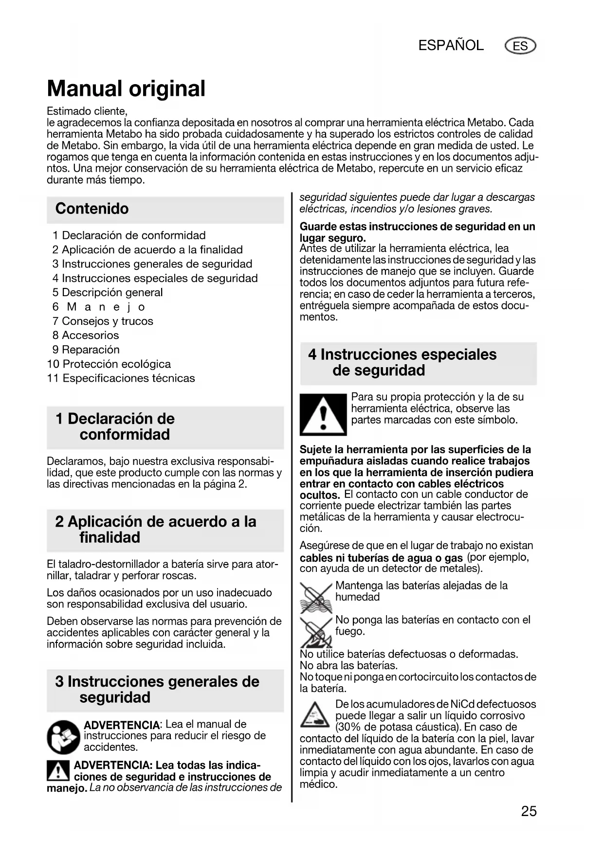 1 Declaración de conformidad 2 Aplicación de acuerdo a la finalidad 3 Instrucciones generales de seguridad 4 Instrucciones especiales de seguridad 5 Descripción general 6Manejo 7 Consejos y trucos 8 Accesorios 9 Reparación 10 Protección ecológica 11 Especificaciones técnicas Declaramos, bajo nuestra exclusiva responsabi- lidad, que este producto cumple con las normas y las directivas mencionadas en la página 2. El taladro-destornillador a batería sirve para ator- nillar, taladrar y perforar roscas. Los daños ocasionados por un uso inadecuado son responsabilidad exclusiva del usuario. Deben observarse las normas para prevención de accidentes aplicables con carácter general y la información sobre seguridad incluida. ADVERTENCIA : Lea el manual de instrucciones para reducir el riesgo de accidentes. ADVERTENCIA: Lea todas las indica- ciones de seguridad e instrucciones de manejo. La no observancia de las instrucciones de seguridad siguientes puede dar lugar a descargas eléctricas, incendios y/o lesiones graves. Guarde estas instrucciones de seguridad en un lugar seguro. Antes de utilizar la herramienta eléctrica, lea detenidamente las instrucciones de seguridad y las instrucciones de manejo que se incluyen. Guarde todos los documentos adjuntos para futura refe- rencia; en caso de ceder la herramienta a terceros, entréguela siempre acompañada de estos docu- mentos. Para su propia protección y la de su herramienta eléctrica, observe las partes marcadas con este símbolo. Sujete la herramienta por las superficies de la empuñadura aisladas cuando realice trabajos en los que la herramienta de inserción pudiera entrar en contacto con cables eléctricos ocultos. El contacto con un cable conductor de corriente puede electrizar también las partes metálicas de la herramienta y causar electrocu- ción. Asegúrese de que en el lugar de trabajo no existan cables ni tuberías de agua o gas (por ejemplo, con ayuda de un detector de metales). Mantenga las baterías alejadas de la humedad No ponga las baterías en contacto con el fuego. No utilice baterías defectuosas o deformadas. No abra las baterías. No toque ni ponga en cortocircuito los contactos de la batería. De los acumuladores de NiCd defectuosos puede llegar a salir un líquido corrosivo (30% de potasa cáustica). En caso de contacto del líquido de la batería con la piel, lavar inmediatamente con agua abundante. En caso de contacto del líquido con los ojos, lavarlos con agua limpia y acudir inmediatamente a un centro médico. Manual original Estimado cliente, le agradecemos la confianza depositada en nosotros al comprar una herramienta eléctrica Metabo. Cada herramienta Metabo ha sido probada cuidadosamente y ha superado los estrictos controles de calidad de Metabo. Sin embargo, la vida útil de una herramienta eléctrica depende en gran medida de usted. Le rogamos que tenga en cuenta la información contenida en estas instrucciones y en los documentos adju- ntos. Una mejor conservación de su herramienta eléctrica de Metabo, repercute en un servicio eficaz durante más tiempo. Contenido 1 Declaración de conformidad 2 Aplicación de acuerdo a la finalidad 3 Instrucciones generales de seguridad 4 Instrucciones especiales de seguridad 17026985_1010 BS 12 NiCd.book Seite 25 Mittwoch, 13. Oktober 2010 8:31 0826 ESPAÑOL