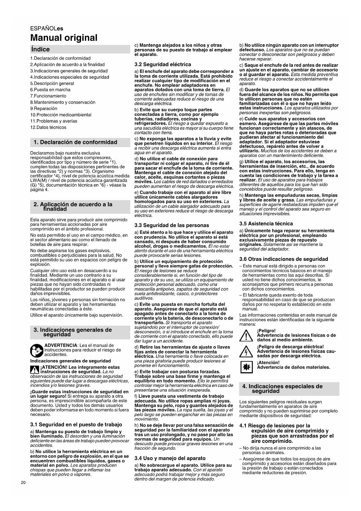 Manual original 1.Declaración de conformidad 2.Aplicación de acuerdo a la finalidad 3.Indicaciones generales de seguridad 4.Indicaciones especiales de seguridad 5.Descripción general 6.Puesta en marcha 7.Funcionamiento 8.Mantenimiento y conservación 9.Reparación 10.Protección medioambiental 11.Problemas y averías 12.Datos técnicos Declaramos bajo nuestra exclusiva responsabilidad que estos compresores, identificados por tipo y número de serie *1), cumplen todas las disposiciones pertinentes de las directivas *2) y normas *3). Organismo certificador *4), nivel de potencia acústica medida LWA(M) / nivel de potencia acústica garantizada (G) *5), documentación técnica en *6) - véase la página 4. Esta aparato sirve para producir aire comprimido para herramientas accionadas por aire comprimido en el ámbito profesional. No está permitido el uso en el campo médico, en el sector alimentario así como el llenado de botellas de aire para respirar. No debe aspirarse los gases explosivos, combustibles o perjudiciales para la salud. No está permitido su uso en espacios con peligro de explosión. Cualquier otro uso está en desacuerdo a su finalidad. Mediante un uso contrario a su finalidad, modificaciones en el aparato o al usar piezas que no hayan sido controladas ni habilitadas por el productor se pueden producir daños imprevisibles. Los niños, jóvenes y personas sin formación no deben utilizar el aparato y las herramientas neumáticas conectadas a éste. Utilice el aparato únicamente bajo supervisión. ADVERTENCIA: Lea el manual de instrucciones para reducir el riesgo de accidentes. Indicaciones generales de seguridad ¡ATENCIÓN! Lea íntegramente estas instrucciones de seguridad. La no observación de las instrucciones de seguridad siguientes puede dar lugar a descargas eléctricas, incendios y/o lesiones graves. ¡Guarde estas instrucciones de seguridad en un lugar seguro! Si entrega su aparato a otra persona, es imprescindible acompañarla de este documento. Usted y todos los demás usuarios deben poder informarse en todo momento si fuera necesario.
