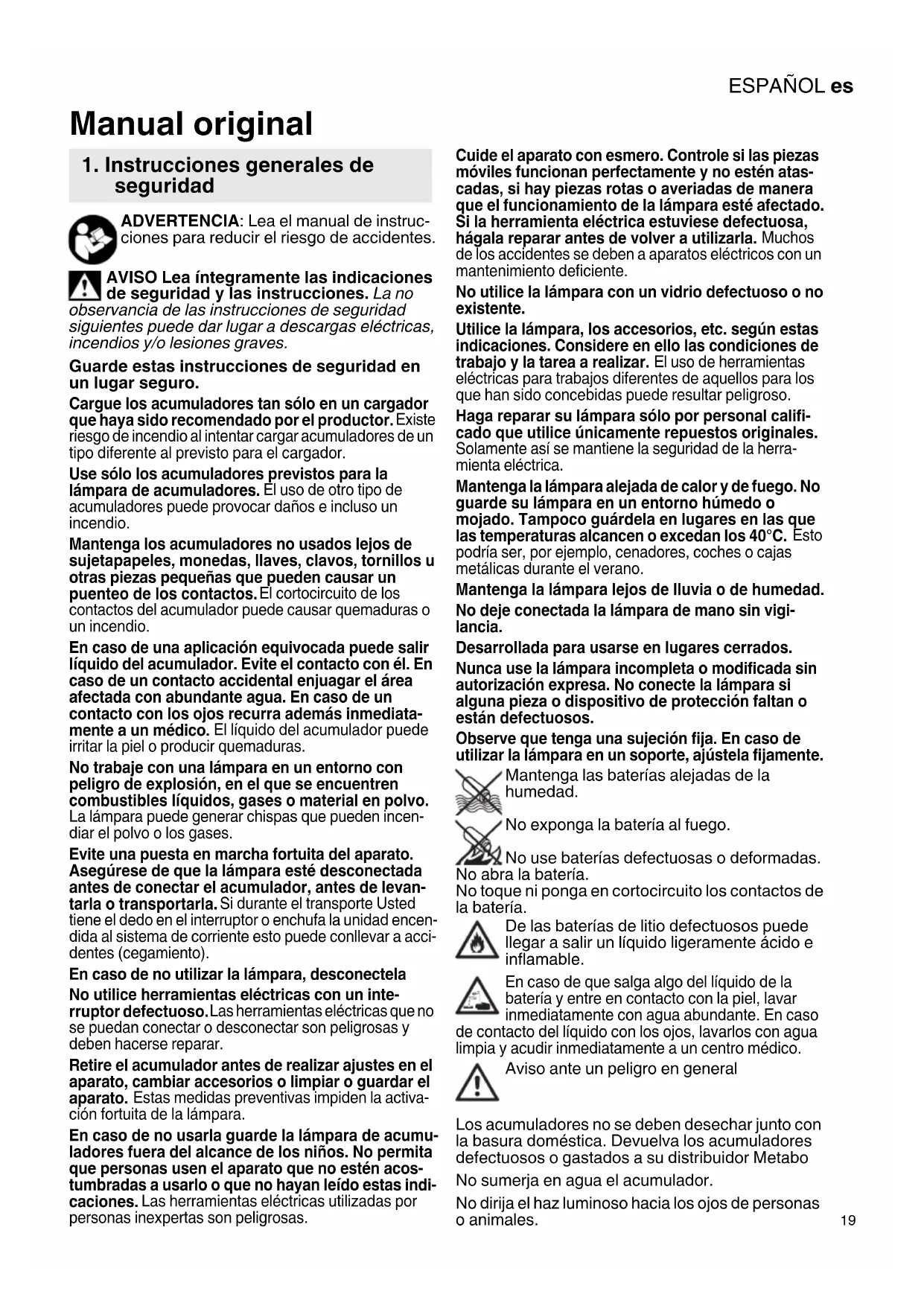ADVERTENCIA: Lea el manual de instruc- ciones para reducir el riesgo de accidentes. AVISO Lea íntegramente las indicaciones de seguridad y las instrucciones. La no observancia de las instrucciones de seguridad siguientes puede dar lugar a descargas eléctricas, incendios y/o lesiones graves. Guarde estas instrucciones de seguridad en un lugar seguro. Cargue los acumuladores tan sólo en un cargador que haya sido recomendado por el productor. Existe riesgo de incendio al intentar cargar acumuladores de un tipo diferente al previsto para el cargador. Use sólo los acumuladores previstos para la lámpara de acumuladores. El uso de otro tipo de acumuladores puede provocar daños e incluso un incendio. Mantenga los acumuladores no usados lejos de sujetapapeles, monedas, llaves, clavos, tornillos u otras piezas pequeñas que pueden causar un puenteo de los contactos. El cortocircuito de los contactos del acumulador puede causar quemaduras o un incendio. En caso de una aplicación equivocada puede salir líquido del acumulador. Evite el contacto con él. En caso de un contacto accidental enjuagar el área afectada con abundante agua. En caso de un contacto con los ojos recurra además inmediata- mente a un médico. El líquido del acumulador puede irritar la piel o producir quemaduras. No trabaje con una lámpara en un entorno con peligro de explosión, en el que se encuentren combustibles líquidos, gases o material en polvo. La lámpara puede generar chispas que pueden incen- diar el polvo o los gases. Evite una puesta en marcha fortuita del aparato. Asegúrese de que la lámpara esté desconectada antes de conectar el acumulador, antes de levan- tarla o transportarla. Si durante el transporte Usted tiene el dedo en el interruptor o enchufa la unidad encen- dida al sistema de corriente esto puede conllevar a acci- dentes (cegamiento). En caso de no utilizar la lámpara, desconectela No utilice herramientas eléctricas con un inte- rruptor defectuoso. Las herramientas eléctricas que no se puedan conectar o desconectar son peligrosas y deben hacerse reparar. Retire el acumulador antes de realizar ajustes en el aparato, cambiar accesorios o limpiar o guardar el aparato. Estas medidas preventivas impiden la activa- ción fortuita de la lámpara. En caso de no usarla guarde la lámpara de acumu- ladores fuera del alcance de los niños. No permita que personas usen el aparato que no estén acos- tumbradas a usarlo o que no hayan leído estas indi- caciones. Las herramientas eléctricas utilizadas por personas inexpertas son peligrosas. Cuide el aparato con esmero. Controle si las piezas móviles funcionan perfectamente y no estén atas- cadas, si hay piezas rotas o averiadas de manera que el funcionamiento de la lámpara esté afectado. Si la herramienta eléctrica estuviese defectuosa, hágala reparar antes de volver a utilizarla. Muchos de los accidentes se deben a aparatos eléctricos con un mantenimiento deficiente. No utilice la lámpara con un vidrio defectuoso o no existente. Utilice la lámpara, los accesorios, etc. según estas indicaciones. Considere en ello las condiciones de trabajo y la tarea a realizar. El uso de herramientas eléctricas para trabajos diferentes de aquellos para los que han sido concebidas puede resultar peligroso. Haga reparar su lámpara sólo por personal califi- cado que utilice únicamente repuestos originales. Solamente así se mantiene la seguridad de la herra- mienta eléctrica. Mantenga la lámpara alejada de calor y de fuego. No guarde su lámpara en un entorno húmedo o mojado. Tampoco guárdela en lugares en las que las temperaturas alcancen o excedan los 40°C. Esto podría ser, por ejemplo, cenadores, coches o cajas metálicas durante el verano. Mantenga la lámpara lejos de lluvia o de humedad. No deje conectada la lámpara de mano sin vigi- lancia. Desarrollada para usarse en lugares cerrados. Nunca use la lámpara incompleta o modificada sin autorización expresa. No conecte la lámpara si alguna pieza o dispositivo de protección faltan o están defectuosos. Observe que tenga una sujeción fija. En caso de utilizar la lámpara en un soporte, ajústela fijamente. Mantenga las baterías alejadas de la humedad. No exponga la batería al fuego. No use baterías defectuosas o deformadas. No abra la batería. No toque ni ponga en cortocircuito los contactos de la batería. De las baterías de litio defectuosos puede llegar a salir un líquido ligeramente ácido e inflamable. En caso de que salga algo del líquido de la batería y entre en contacto con la piel, lavar inmediatamente con agua abundante. En caso de contacto del líquido con los ojos, lavarlos con agua limpia y acudir inmediatamente a un centro médico. Aviso ante un peligro en general Los acumuladores no se deben desechar junto con la basura doméstica. Devuelva los acumuladores defectuosos o gastados a su distribuidor Metabo No sumerja en agua el acumulador. No dirija el haz luminoso hacia los ojos de personas o animales. Manual original