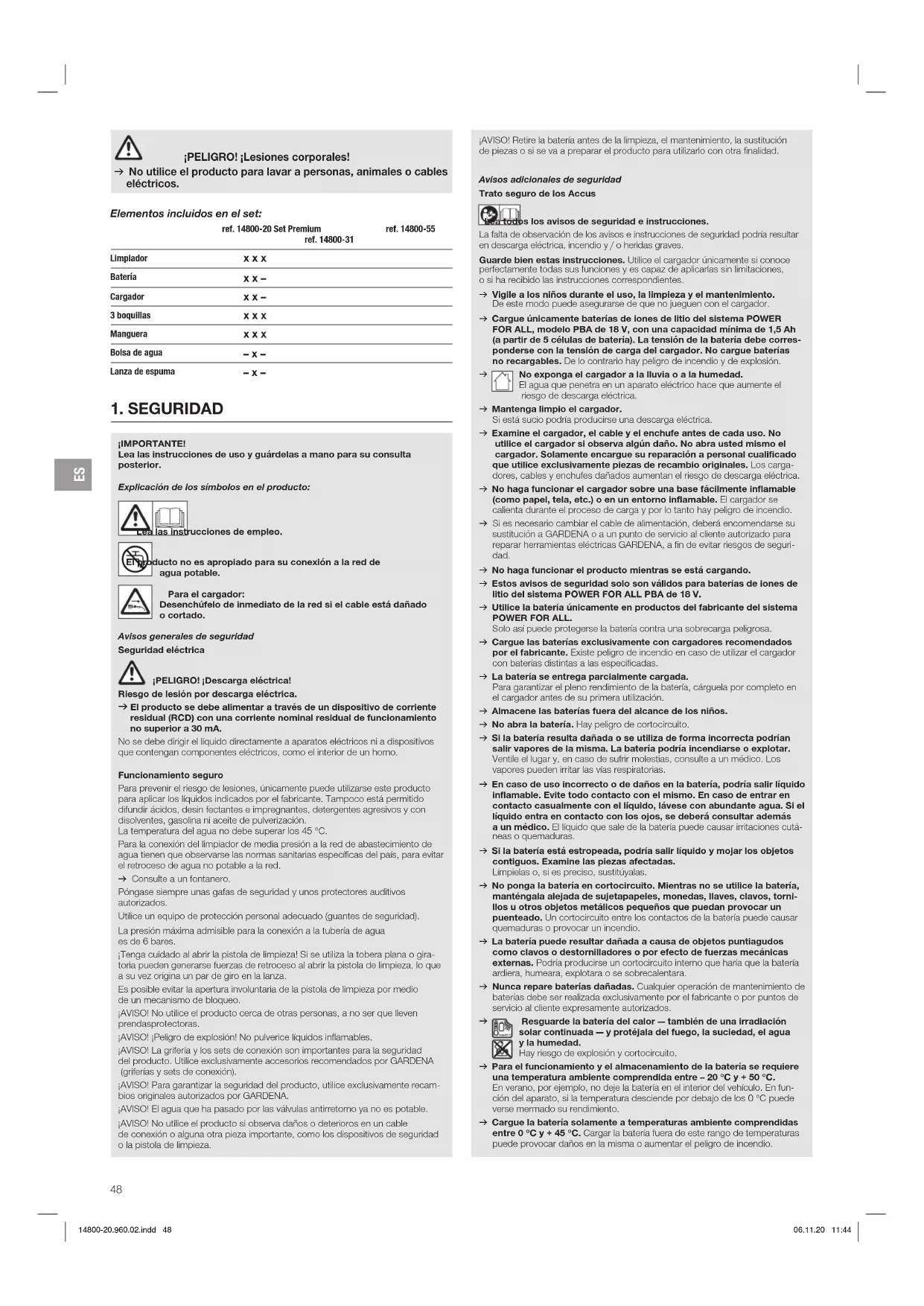 ¡PELIGRO! ¡Lesiones corporales! v No utilice el producto para lavar a personas, animales o cables eléctricos. Elementos incluidos en el set: ref. 14800-20 Set Premium ref. 14800-31 ref. 14800-55 Limpiador x x x Batería x x – Cargador x x – 3 boquillas x x x Manguera x x x Bolsa de agua – x – Lanza de espuma – x – 14800-20.960.02.indd 48 06.11.20 11:44ES