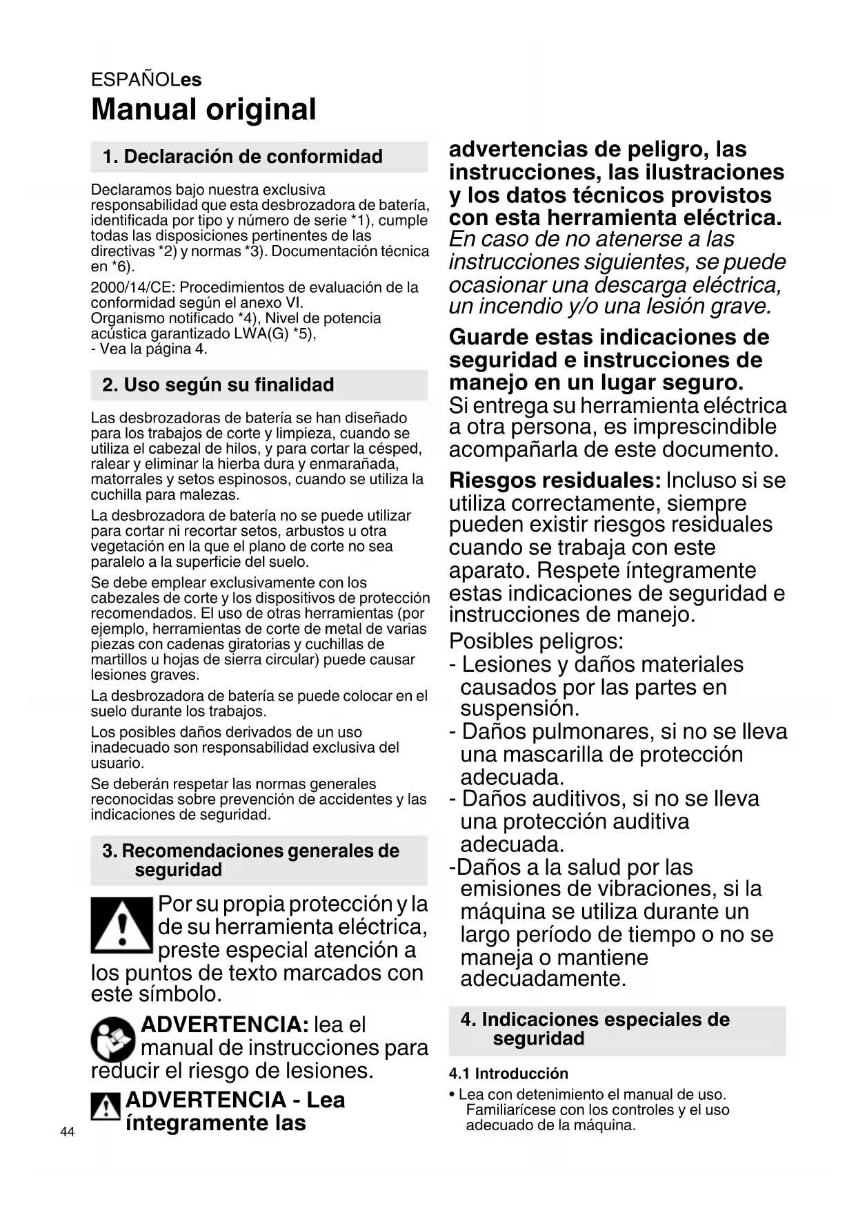 Manual original Declaramos bajo nuestra exclusiva responsabilidad que esta desbrozadora de batería, identificada por tipo y número de serie *1), cumple todas las disposiciones pertinentes de las directivas *2) y normas *3). Documentación técnica en *6). 2000/14/CE: Procedimientos de evaluación de la conformidad según el anexo VI. Organismo notificado *4), Nivel de potencia acústica garantizado LWA(G) *5), - Vea la página 4. Las desbrozadoras de batería se han diseñado para los trabajos de corte y limpieza, cuando se utiliza el cabezal de hilos, y para cortar la césped, ralear y eliminar la hierba dura y enmarañada, matorrales y setos espinosos, cuando se utiliza la cuchilla para malezas. La desbrozadora de batería no se puede utilizar para cortar ni recortar setos, arbustos u otra vegetación en la que el plano de corte no sea paralelo a la superficie del suelo. Se debe emplear exclusivamente con los cabezales de corte y los dispositivos de protección recomendados. El uso de otras herramientas (por ejemplo, herramientas de corte de metal de varias piezas con cadenas giratorias y cuchillas de martillos u hojas de sierra circular) puede causar lesiones graves. La desbrozadora de batería se puede colocar en el suelo durante los trabajos. Los posibles daños derivados de un uso inadecuado son responsabilidad exclusiva del usuario. Se deberán respetar las normas generales reconocidas sobre prevención de accidentes y las indicaciones de seguridad. Por su propia protección y la de su herramienta eléctrica, preste especial atención a los puntos de texto marcados con este símbolo. ADVERTENCIA: lea el manual de instrucciones para reducir el riesgo de lesiones. ADVERTENCIA - Lea íntegramente las advertencias de peligro, las instrucciones, las ilustraciones y los datos técnicos provistos con esta herramienta eléctrica. En caso de no atenerse a las instrucciones siguientes, se puede ocasionar una descarga eléctrica, un incendio y/o una lesión grave. Guarde estas indicaciones de seguridad e instrucciones de manejo en un lugar seguro. Si entrega su herramienta eléctrica a otra persona, es imprescindible acompañarla de este documento. Riesgos residuales: Incluso si se utiliza correctamente, siempre pueden existir riesgos residuales cuando se trabaja con este aparato. Respete íntegramente estas indicaciones de seguridad e instrucciones de manejo. Posibles peligros: - Lesiones y daños materiales causados por las partes en suspensión. - Daños pulmonares, si no se lleva una mascarilla de protección adecuada. - Daños auditivos, si no se lleva una protección auditiva adecuada. -Daños a la salud por las emisiones de vibraciones, si la máquina se utiliza durante un largo período de tiempo o no se maneja o mantiene adecuadamente.
