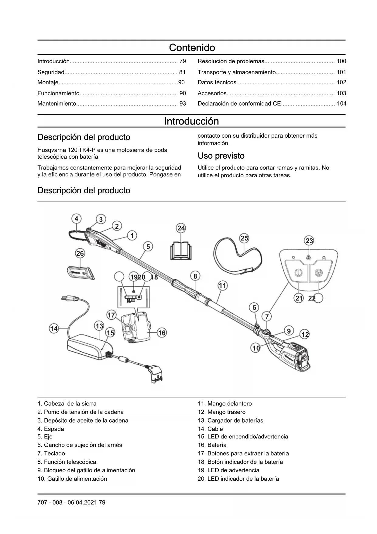 - Declaración de conformidad CE Introducción Descripción del producto Husqvarna 120iTK4-P es una motosierra de poda telescópica con batería. Trabajamos constantemente para mejorar la seguridad y la eficiencia durante el uso del producto. Póngase en contacto con su distribuidor para obtener más información. Uso previsto Utilice el producto para cortar ramas y ramitas. No utilice el producto para otras tareas. Descripción del producto p. 104