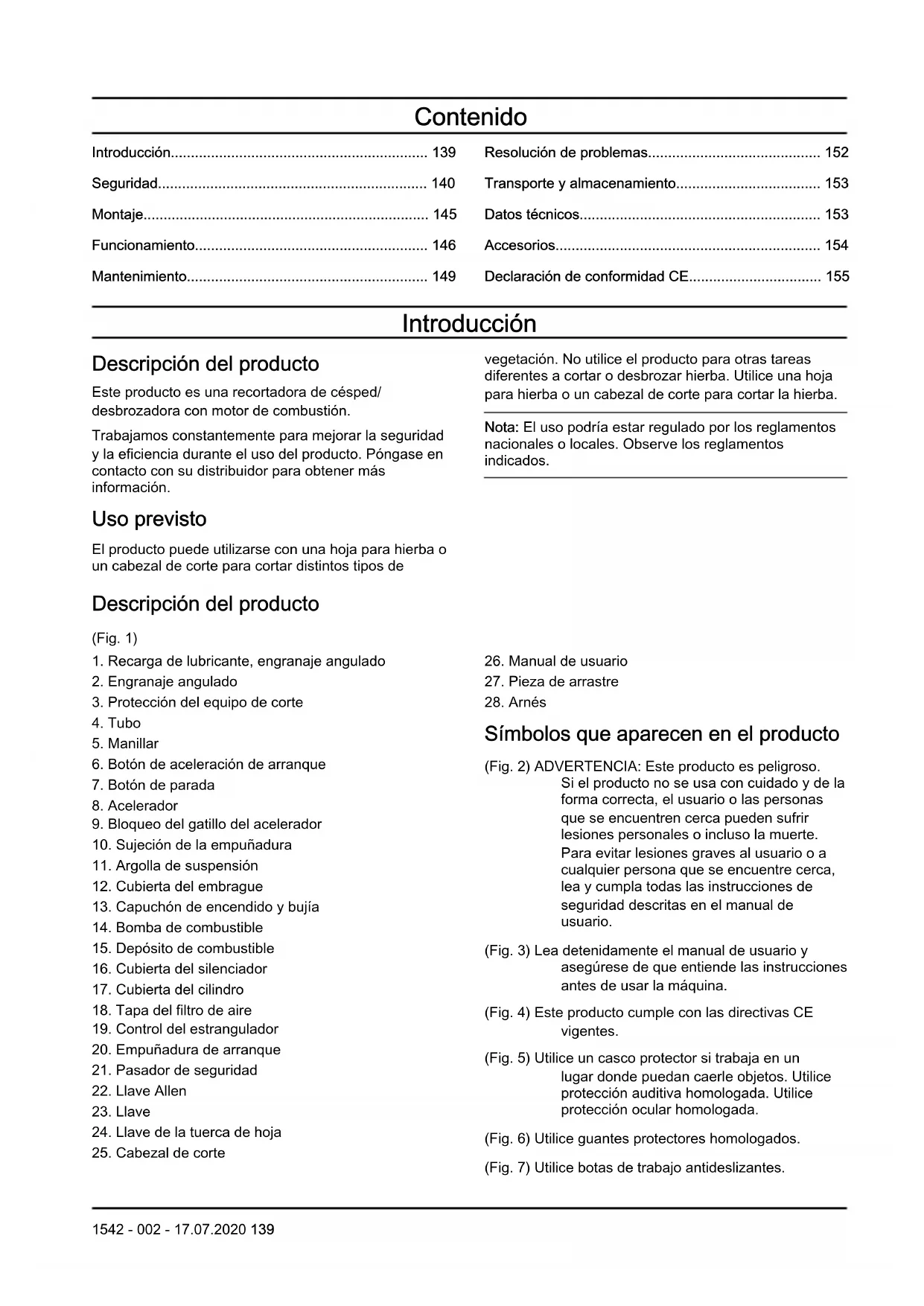 - Declaración de conformidad CE Introducción Descripción del producto Este producto es una recortadora de césped/ desbrozadora con motor de combustión. Trabajamos constantemente para mejorar la seguridad y la eficiencia durante el uso del producto. Póngase en contacto con su distribuidor para obtener más información. Uso previsto El producto puede utilizarse con una hoja para hierba o un cabezal de corte para cortar distintos tipos de vegetación. No utilice el producto para otras tareas diferentes a cortar o desbrozar hierba. Utilice una hoja para hierba o un cabezal de corte para cortar la hierba. Nota: El uso podría estar regulado por los reglamentos nacionales o locales. Observe los reglamentos indicados. Descripción del producto (Fig. 1) p. 155