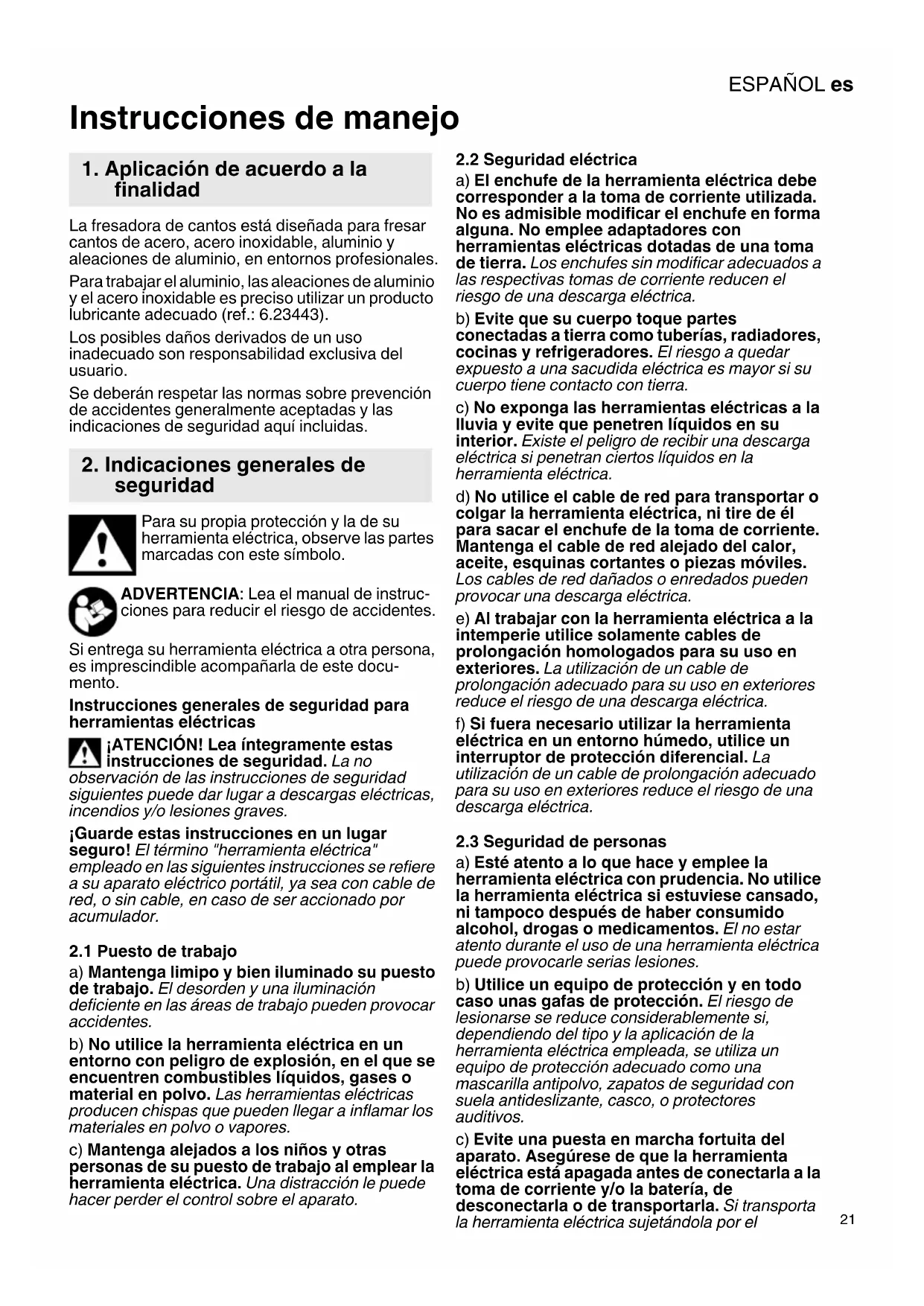 Instrucciones de manejo La fresadora de cantos está diseñada para fresar cantos de acero, acero inoxidable, aluminio y aleaciones de aluminio, en entornos profesionales. Para trabajar el aluminio, las aleaciones de aluminio y el acero inoxidable es preciso utilizar un producto lubricante adecuado (ref.: 6.23443). Los posibles daños derivados de un uso inadecuado son responsabilidad exclusiva del usuario. Se deberán respetar las normas sobre prevención de accidentes generalmente aceptadas y las indicaciones de seguridad aquí incluidas. Para su propia protección y la de su herramienta eléctrica, observe las partes marcadas con este símbolo. ADVERTENCIA: Lea el manual de instruc- ciones para reducir el riesgo de accidentes. Si entrega su herramienta eléctrica a otra persona, es imprescindible acompañarla de este docu- mento. Instrucciones generales de seguridad para herramientas eléctricas ¡ATENCIÓN! Lea íntegramente estas instrucciones de seguridad. La no observación de las instrucciones de seguridad siguientes puede dar lugar a descargas eléctricas, incendios y/o lesiones graves. ¡Guarde estas instrucciones en un lugar seguro! El término "herramienta eléctrica" empleado en las siguientes instrucciones se refiere a su aparato eléctrico portátil, ya sea con cable de red, o sin cable, en caso de ser accionado por acumulador.