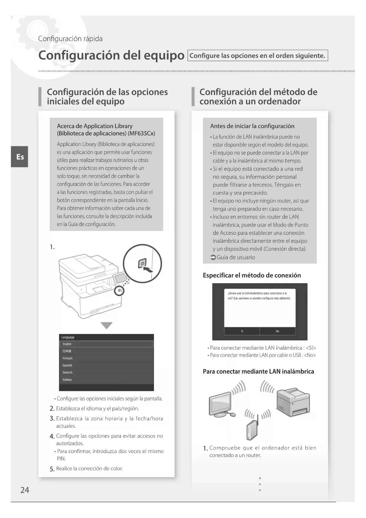 Configuración del equipo Configuración de las opciones iniciales del equipo Configure las opciones en el orden siguiente. Conguración rápida EsPara obtener más detalles "Congurar usando la guía de conguración" en la Guía de usuario Compruebe las opciones de red en el ordenador. Apunte el SSID y la clave de red.• Consulte la etiqueta del router. Guía de usuario• La operación de configuración es más sencilla si el router se suministra con una marca WPS. Guía de usuario Establezca el punto de acceso y la clave de red según la pantalla.1. Pulse <Aceptar>.2. Pulse <Opciones de SSID>.3. Pulse <Seleccionar punto de acceso>.4. Seleccione el punto de acceso (SSID) y pulse <Siguiente>.5. Introduzca una clave WEP (clave de red) y pulse <Aplicar>.6. Pulse <Sí>.• La dirección IP se configurará automáticamente en unos minutos.• Aparece "Conectado.". Instale el controlador y el software. "Instalar el software" en la página 26Ya ha finalizado la configuración de las opciones iniciales.Si su equipo incorpora función de fax, proceda a configurar las opciones de fax. página 27 Para conectar mediante LAN por cable El equipo no incluye ningún cable LAN.Tenga uno preparado en caso necesario. Compruebe que el ordenador está bien conectado a un router. Compruebe las opciones de red en el ordenador. Conecte el cable LAN.• Tras conectar el cable, espere unos minutos (hasta que la dirección IP se configure automáticamente).• Si se ha configurado una dirección IP estática en el ordenador, configure la dirección IP del ordenador manualmente. Instale el controlador y el software. "Instalar el software" en la página 26Ya ha finalizado la configuración de las opciones iniciales.Si su equipo incorpora función de fax, proceda a configurar las opciones de fax. página 27