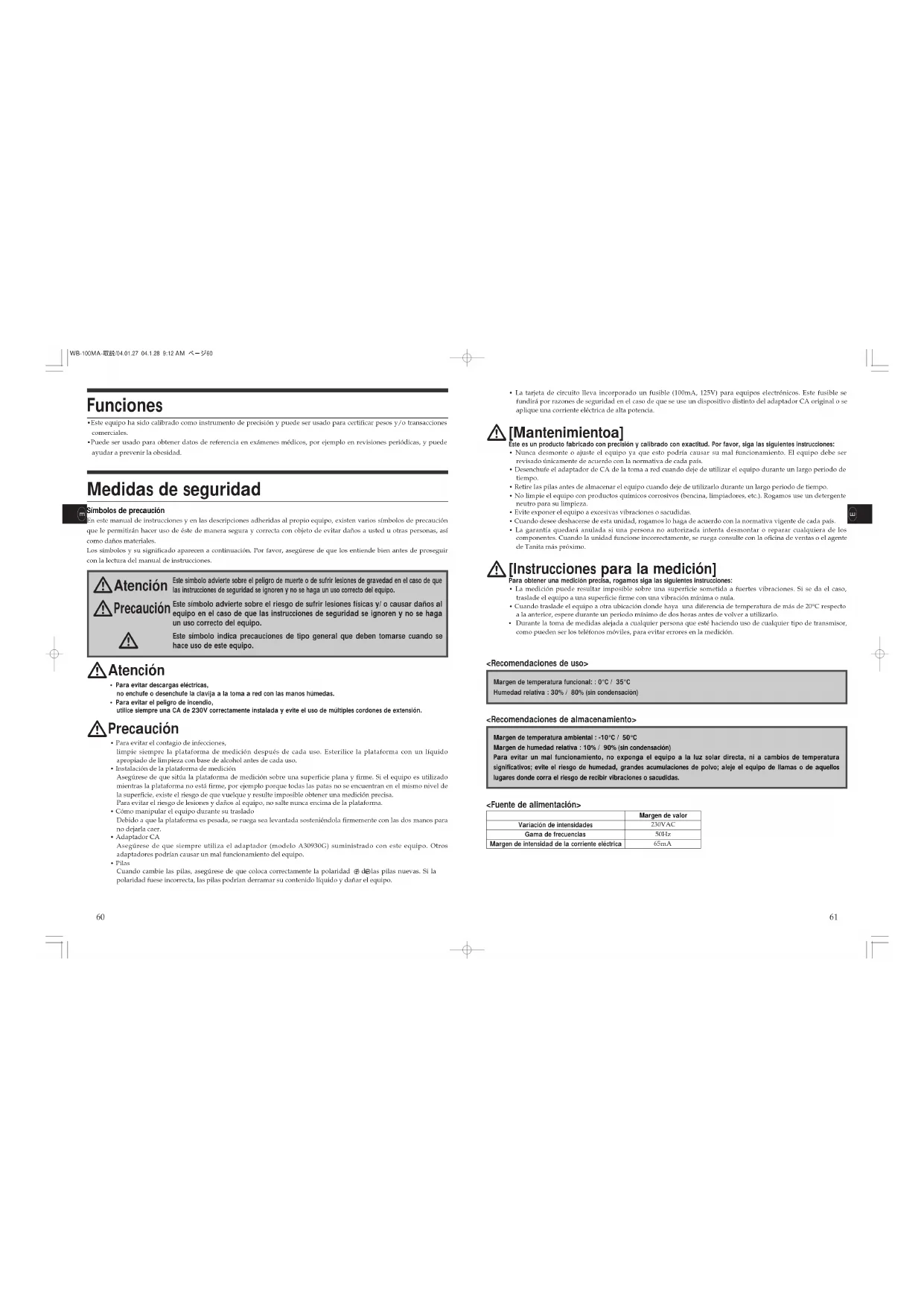 [Mantenimientoa] Este es un producto fabricado con precisión y calibrado con exactitud. Por favor, siga las siguientes instrucciones:• Nunca desmonte o ajuste el equipo ya que esto podría causar su mal funcionamiento. El equipo debe serrevisado únicamente de acuerdo con la normativa de cada país.• Desenchufe el adaptador de CA de la toma a red cuando deje de utilizar el equipo durante un largo periodo detiempo.• Retire las pilas antes de almacenar el equipo cuando deje de utilizarlo durante un largo periodo de tiempo.• No limpie el equipo con productos químicos corrosivos (bencina, limpiadores, etc.). Rogamos use un detergenteneutro para su limpieza.• Evite exponer el equipo a excesivas vibraciones o sacudidas.• Cuando desee deshacerse de esta unidad, rogamos lo haga de acuerdo con la normativa vigente de cada país.• La garantía quedará anulada si una persona no autorizada intenta desmontar o reparar cualquiera de loscomponentes. Cuando la unidad funcione incorrectamente, se ruega consulte con la oficina de ventas o el agentede Tanita más próximo.