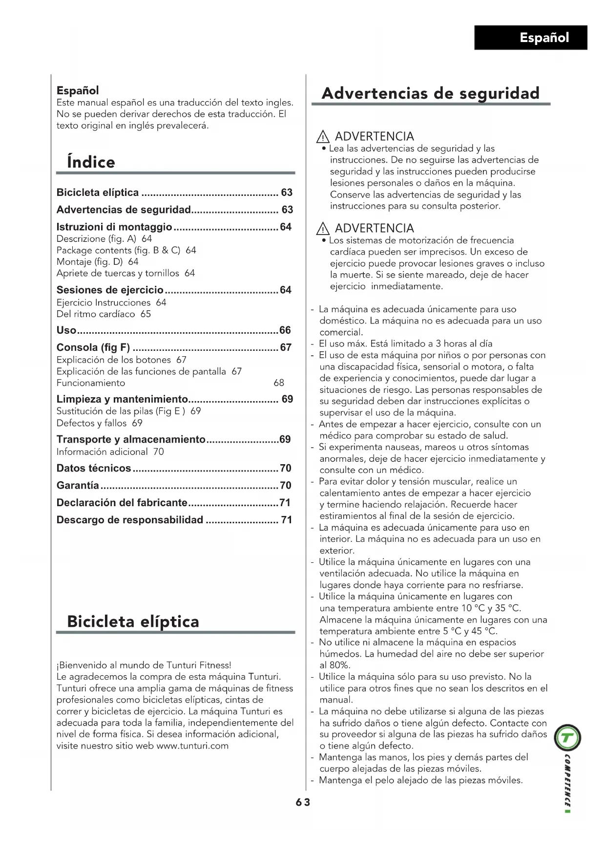 - Battery size AA Garanzia Garanzia dell’attrezzo sportivo Tunturi Condizioni di garanzia Il consumatore è tutelato da tutti i diritti previsti dalla legislazione nazionale e riguardanti l’acquisto di beni di consumo. Questi diritti fondamentali non sono limitati dalle condizioni di garanzia. La garanzia entra in vigore solo se l’attrezzo in questione prodotto dall’azienda Tunturi Ltd. viene utilizzato in linea con le condizioni ambientali d’uso specificate dal fabbricante. Le condizioni ambientali d’uso degli attrezzi son Condizioni per la garanzia La garanzia entra in vigore dalla data dell’acquisto dell’attrezzo. Le condizioni per la garanzia possono variare in funzione del paese. Rivolgersi al rivenditore di zona per maggiori informazioni sulle condizioni per la garanzia. Copertura della garanzia L’azienda Tunturi Ltd ed i suoi rappresentanti non rispondono per nessun motivo dei danni indiretti causati all’acquirente dall’attrezzo. Per danni indiretti s’intendono quelli relativi al mandato sfruttamento dell’attrezzo, mancato guadagno o altri danni di natura economica. Limiti di garanzia La garanzia copre i difetti di materiale e fabbrica dell’attrezzo che si manifestano subito dopo l’acquisto. La garanzia copre solo i difetti che si manifestano durante l’uso normale e conforme alle istruzioni del manuale di installazione, manutenzione ed uso fornito da Tunturi. L’azienda Tunturi Ltd ed i suoi rivenditori non rispondono dei danni causati da eventi al di fuori del loro controllo. La garanzia riguarda solo il proprietario originario dell’attrezzo ed è in vigore solo in quei paesi in cui Tunturi Ltd dispone di un proprio rappresentante autorizzato. La garanzia non copre i difetti di quegli attrezzi o componenti che sono stati modificati senza l’espressa autorizzazione del fabbricante Tunturi Ltd. La garanzia non copre i difetti causati dalla normale usura, da un uso in condizioni non previste, dalla corrosione, dalla movimentazione e dal trasporto. La garanzia non copre rumori o suoni emessi durante l’uso a meno che non impediscano l’uso dell’attrezzo e che non siano causati da un guasto all’attrezzo stesso.La garanzia non comprende nemmeno i normali interventi di servizio dell’attrezzo, come per esempio la pulizia, lubrificazione, controllo periodico dei componenti né le piccole installazioni che può effettuare il cliente stesso e che non richiedono lo smontaggio/montaggio dell’attrezzo. Questi interventi sono, per esempio, la sostituzione del pannello, dei62 Italiano pedali o di altri componenti analoghi. La garanzia non copre gli interventi di riparazione previsti, se non vengono eseguiti da un rappresentante autorizzato Tunturi. Se sbagliate a seguire le istruzioni del manuale d’uso, decade subito la garanzia sul prodotto. Dichiarazione del fabbricante Tunturi New Fitness BV dichiara che questo prodotto è conforme ai seguenti standard e direttive: EN 957 (HB), 89/336/CEE. Pertanto sul prodotto è apposto il marchio CE. 01-2017 Tunturi New Fitness BV Purmerweg 1 1311 XE Almere Paesi Bassi Clausola di esonero della responsabilità © 2017 Tunturi New Fitness BV Tutti i diritti riservati. Il prodotto e il manuale sono soggetti a modifiche. Le specifiche tecniche possono essere modificate senza preavviso.63 Español Bicicleta elíptica ¡Bienvenido al mundo de Tunturi Fitness!Le agradecemos la compra de esta máquina Tunturi. Tunturi ofrece una amplia gama de máquinas de fitness profesionales como bicicletas elípticas, cintas de correr y bicicletas de ejercicio. La máquina Tunturi es adecuada para toda la familia, independientemente del nivel de forma física. Si desea información adicional, visite nuestro sitio web www.tunturi.com Bicicleta elíptica p. 63