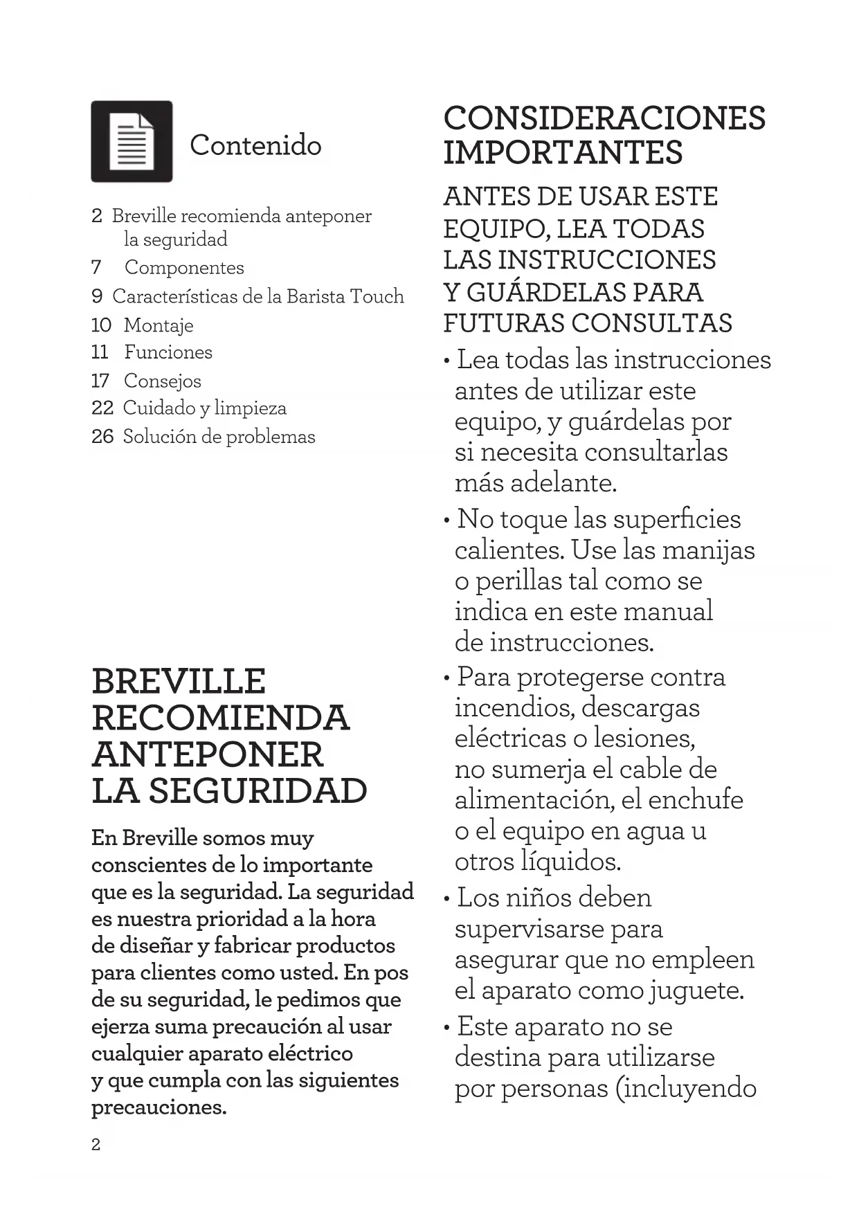 - Este aparato no se destina para utilizarse por personas (incluyendo Contenido 2 Breville recomienda anteponer laseguridad7 Componentes9 Características de la Barista Touch10 Montaje11 Funciones17 Consejos22 Cuidado ylimpieza26 Solución de problemas3 ES-MX niños), cuyas capacidades físicas, sensoriales o mentales sean diferentes o estén reducidas o carezcan de experiencia o conocimiento.