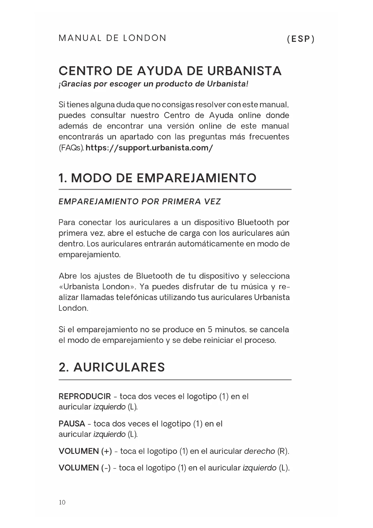 Los auriculares se cargan automáticamente cuando se colo- can dentro del estuche de carga. Los indicadores luminosos de batería (3) parpadean una vez cuando los auriculares se colocan en el estuche. Los indicadores luminosos externos parpadearán cada 10 segundos hasta que los auriculares estén completamente cargados.12 MANUAL DE LONDON (ESP) Para cargar el estuche: conecta el cable de tipo C a una fuente de alimentación o coloca el estuche sobre un cargador con certificado Qi. Los indicadores luminosos de batería continua- rán parpadeando hasta que el estuche esté totalmente car- gado. Una vez esté completamente cargado los indicadores luminosos de batería permanecerán iluminados de forma continua. Si los indicadores luminosos de batería no funcionan como se ha descrito anteriormente, desconecta el cargador del estuche de carga y vuelve a conectarlo. ALMOHADILLAS DE SILICONA - Se incluyen almohadillas de silicona en varios tamaños. Elige el tamaño que mejor se adapte a tus oídos de forma que los auriculares se encuentren cómodamente alojados y cancelen correctamente el ruido ambiental. Para limpiarlas, extrae las almohadillas de silicona y sumérge- las en agua templada con jabón. Después de sumergirlas, utili- za un bastoncillo de algodón para limpiarlas cuidadosamente. Enjuaga las almohadillas con abundante agua y sécalas con un paño. No las vuelvas a poner en los auriculares hasta que estén completamente secas. REINICIO - Elimina «Urbanista London» de los ajustes de Bluetooth de tu dispositivo. Pulsa el botón de reinicio de Urbanista (2) durante 10 segun- dos con los auriculares todavía dentro del estuche hasta que los 4 indicadores luminosos de batería (3) parpadeen simultá- neamente (asegúrate de que el estuche tiene suficiente carga). Cierra el estuche de carga, el reinicio se habrá efectuado co- rrectamente. Sigue las instrucciones del apartado 1 « Emparejamiento por primera vez» para volver a conectar los auriculares a tu dis- positivo.13 GARANTÍA