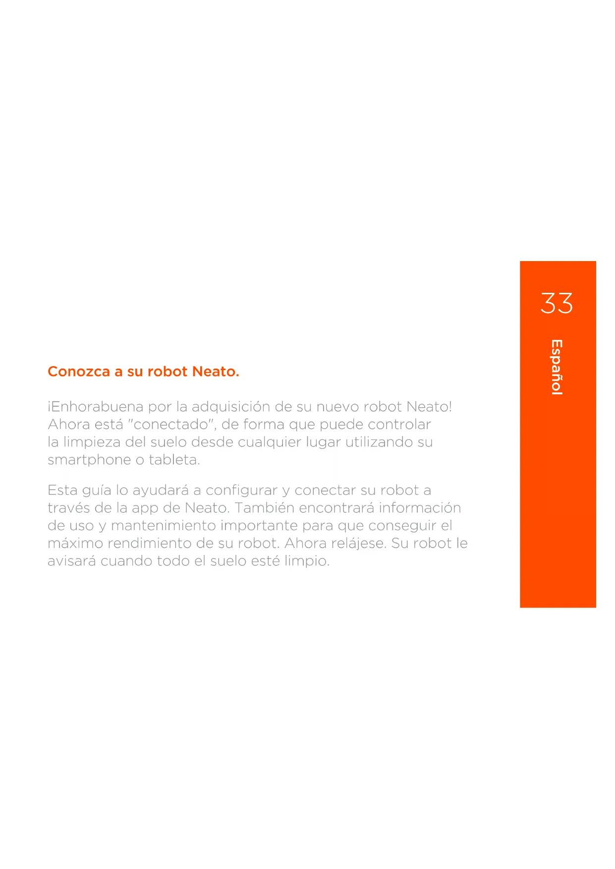 Conozca a su robot Neato. ¡Enhorabuena por la adquisición de su nuevo robot Neato! Ahora está "conectado", de forma que puede controlar la limpieza del suelo desde cualquier lugar utilizando su smartphone o tableta. Esta guía lo ayudará a configurar y conectar su robot a través de la app de Neato. También encontrará información de uso y mantenimiento importante para que conseguir el máximo rendimiento de su robot. Ahora relájese. Su robot le avisará cuando todo el suelo esté limpio.4