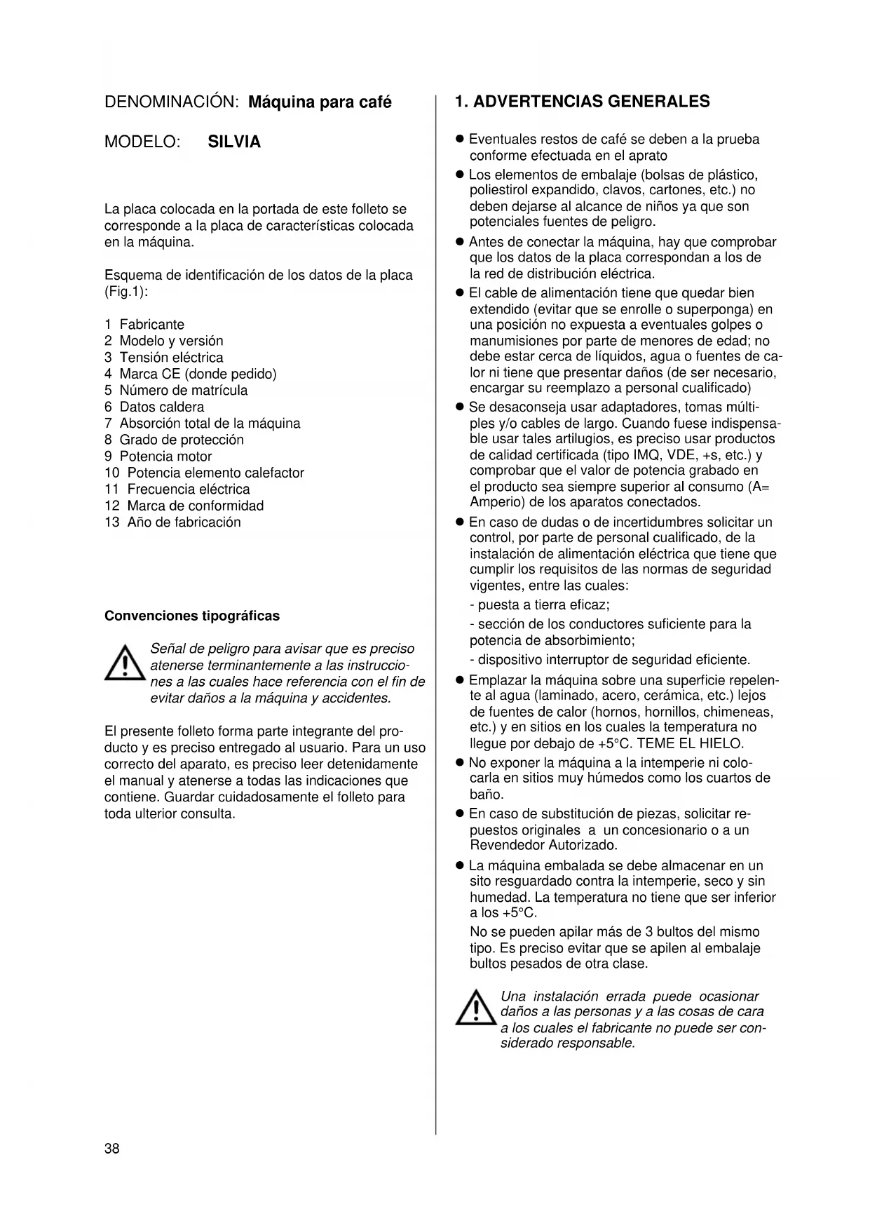 Eventuales restos de café se deben a la prueba conforme efectuada en el aprato Los elementos de embalaje (bolsas de plástico, poliestirol expandido, clavos, cartones, etc.) no deben dejarse al alcance de niños ya que son potenciales fuentes de peligro. Antes de conectar la máquina, hay que comprobar que los datos de la placa correspondan a los de la red de distribución eléctrica. El cable de alimentación tiene que quedar bien extendido (evitar que se enrolle o superponga) en una posición no expuesta a eventuales golpes o manumisiones por parte de menores de edad; no debe estar cerca de líquidos, agua o fuentes de ca- lor ni tiene que presentar daños (de ser necesario, encargar su reemplazo a personal cualificado) Se desaconseja usar adaptadores, tomas múlti- ples y/o cables de largo. Cuando fuese indispensa- ble usar tales artilugios, es preciso usar productos de calidad certificada (tipo IMQ, VDE, +s, etc.) y comprobar que el valor de potencia grabado en el producto sea siempre superior al consumo (A= Amperio) de los aparatos conectados. En caso de dudas o de incertidumbres solicitar un control, por parte de personal cualificado, de la instalación de alimentación eléctrica que tiene que cumplir los requisitos de las normas de seguridad vigentes, entre las cuales: - puesta a tierra eficaz; - sección de los conductores suficiente para la potencia de absorbimiento; - dispositivo interruptor de seguridad eficiente. Emplazar la máquina sobre una superficie repelen- te al agua (laminado, acero, cerámica, etc.) lejos de fuentes de calor (hornos, hornillos, chimeneas, etc.) y en sitios en los cuales la temperatura no llegue por debajo de +5°C. TEME EL HIELO. No exponer la máquina a la intemperie ni colo- carla en sitios muy húmedos como los cuartos de baño. En caso de substitución de piezas, solicitar re- puestos originales a un concesionario o a un Revendedor Autorizado. La máquina embalada se debe almacenar en un sito resguardado contra la intemperie, seco y sin humedad. La temperatura no tiene que ser inferior a los +5°C. No se pueden apilar más de 3 bultos del mismo tipo. Es preciso evitar que se apilen al embalaje bultos pesados de otra clase. Una instalación errada puede ocasionar daños a las personas y a las cosas de cara a los cuales el fabricante no puede ser con- siderado responsable. DENOMINACIÓN: Máquina para café MODELO: SILVIA La placa colocada en la portada de este folleto se corresponde a la placa de características colocada en la máquina. Esquema de identificación de los datos de la placa (Fig.1): 1 Fabricante 2 Modelo y versión 3 Tensión eléctrica 4 Marca CE (donde pedido) 5 Número de matrícula 6 Datos caldera 7 Absorción total de la máquina 8 Grado de protección 9 Potencia motor 10 Potencia elemento calefactor 11 Frecuencia eléctrica 12 Marca de conformidad 13 Año de fabricación Convenciones tipográficas Señal de peligro para avisar que es preciso atenerse terminantemente a las instruccio- nes a las cuales hace referencia con el fin de evitar daños a la máquina y accidentes. El presente folleto forma parte integrante del pro- ducto y es preciso entregado al usuario. Para un uso correcto del aparato, es preciso leer detenidamente el manual y atenerse a todas las indicaciones que contiene. Guardar cuidadosamente el folleto para toda ulterior consulta.39
