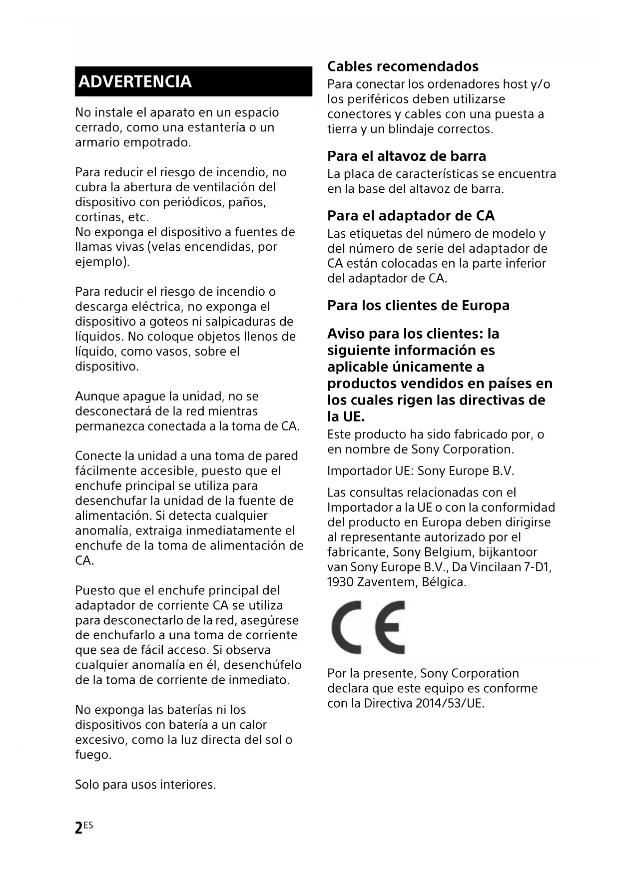 No instale el aparato en un espacio cerrado, como una estantería o un armario empotrado. Para reducir el riesgo de incendio, no cubra la abertura de ventilación del dispositivo con periódicos, paños, cortinas, etc. No exponga el dispositivo a fuentes de llamas vivas (velas encendidas, por ejemplo). Para reducir el riesgo de incendio o descarga eléctrica, no exponga el dispositivo a goteos ni salpicaduras de líquidos. No coloque objetos llenos de líquido, como vasos, sobre el dispositivo. Aunque apague la unidad, no se desconectará de la red mientras permanezca conectada a la toma de CA. Conecte la unidad a una toma de pared fácilmente accesible, puesto que el enchufe principal se utiliza para desenchufar la unidad de la fuente de alimentación. Si detecta cualquier anomalía, extraiga inmediatamente el enchufe de la toma de alimentación de CA. Puesto que el enchufe principal del adaptador de corriente CA se utiliza para desconectarlo de la red, asegúrese de enchufarlo a una toma de corriente que sea de fácil acceso. Si observa cualquier anomalía en él, desenchúfelo de la toma de corriente de inmediato. No exponga las baterías ni los dispositivos con batería a un calor excesivo, como la luz directa del sol o fuego. Solo para usos interiores. Cables recomendados Para conectar los ordenadores host y/o los periféricos deben utilizarse conectores y cables con una puesta a tierra y un blindaje correctos. Para el altavoz de barra La placa de características se encuentra en la base del altavoz de barra. Para el adaptador de CA Las etiquetas del número de modelo y del número de serie del adaptador de CA están colocadas en la parte inferior del adaptador de CA. Para los clientes de Europa Aviso para los clientes: la siguiente información es aplicable únicamente a productos vendidos en países en los cuales rigen las directivas de la UE. Este producto ha sido fabricado por, o en nombre de Sony Corporation. Importador UE: Sony Europe B.V. Las consultas relacionadas con el Importador a la UE o con la conformidad del producto en Europa deben dirigirse al representante autorizado por el fabricante, Sony Belgium, bijkantoor van Sony Europe B.V., Da Vincilaan 7-D1, 1930 Zaventem, Bélgica. Por la presente, Sony Corporation declara que este equipo es conforme con la Directiva 2014/53/UE. ADVERTENCIA3