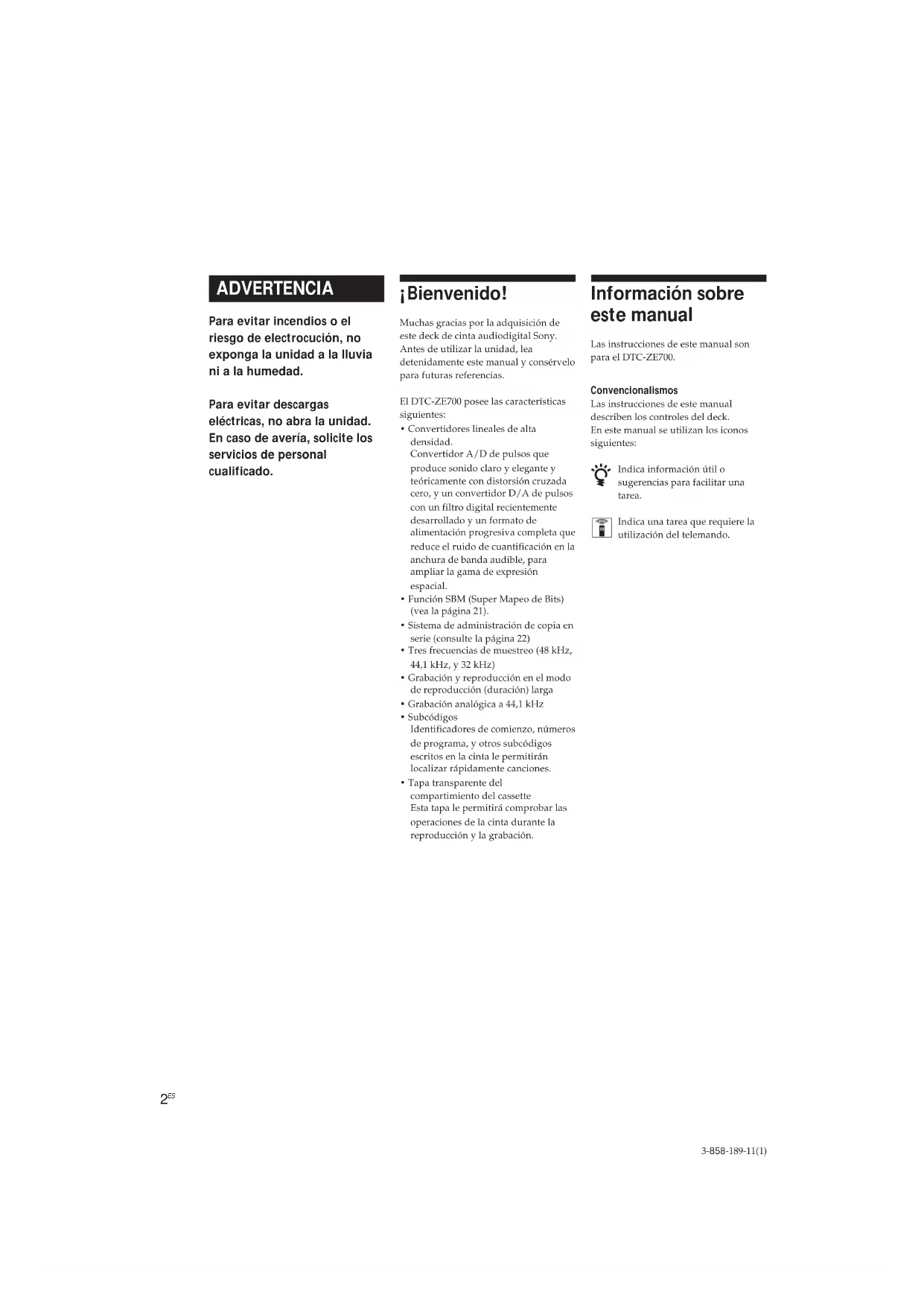 3-858-189-11(1) ADVERTENCIA Para evitar incendios o el riesgo de electrocución, no exponga la unidad a la lluvia ni a la humedad. Para evitar descargas eléctricas, no abra la unidad. En caso de avería, solicite los servicios de personal cualificado. ¡Bienvenido! Muchas gracias por la adquisición de este deck de cinta audiodigital Sony. Antes de utilizar la unidad, lea detenidamente este manual y consérvelo para futuras referencias. El DTC-ZE700 posee las características siguientes: