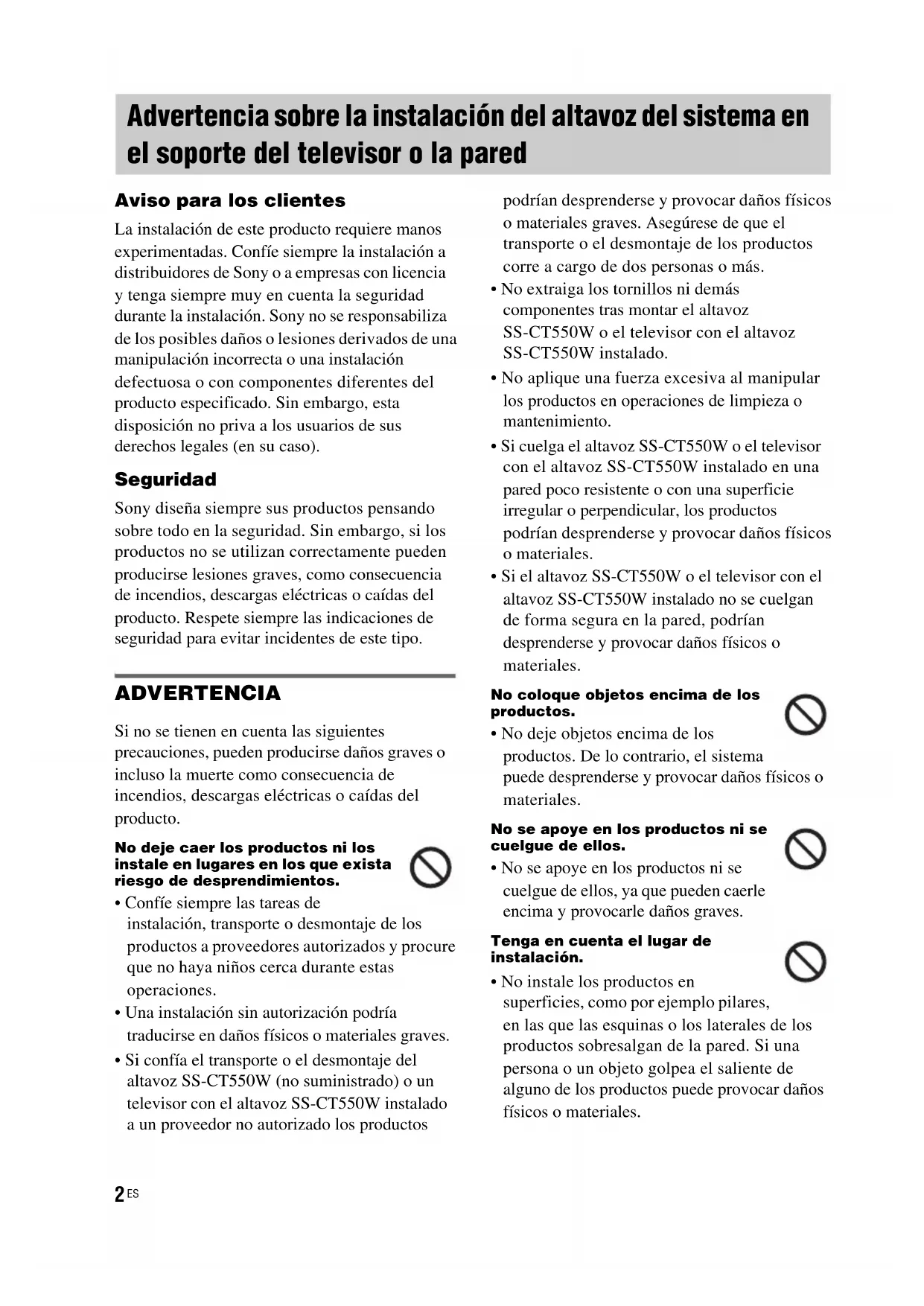 - Si el altavoz SS-CT550W o el televisor con el altavoz SS-CT550W instalado no se cuelgan de forma segura en la pared, podrían desprenderse y provocar daños físicos o materiales. No coloque objetos encima de los productos.