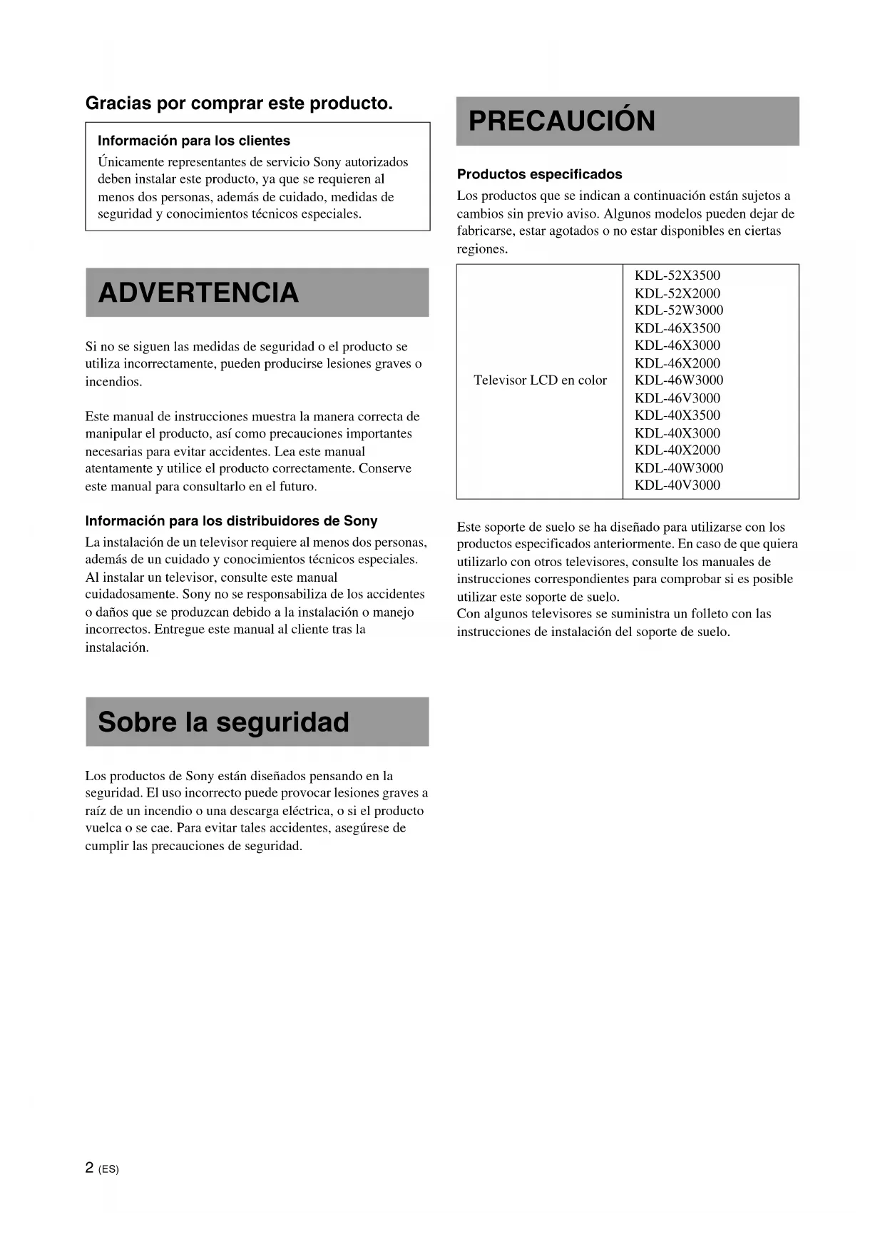 Les repères (C/J) se trouvent sur l’autre face, comme indiqué sur l’illustration ci-dessus. Vis de fixation (S)2 (ES) Gracias por comprar este producto. Si no se siguen las medidas de seguridad o el producto se utiliza incorrectamente, pueden producirse lesiones graves o incendios. Este manual de instrucciones muestra la manera correcta de manipular el producto, así como precauciones importantes necesarias para evitar accidentes. Lea este manual atentamente y utilice el producto correctamente. Conserve este manual para consultarlo en el futuro. Información para los distribuidores de Sony La instalación de un televisor requiere al menos dos personas, además de un cuidado y conocimientos técnicos especiales. Al instalar un televisor, consulte este manual cuidadosamente. Sony no se responsabiliza de los accidentes o daños que se produzcan debido a la instalación o manejo incorrectos. Entregue este manual al cliente tras la instalación. Los productos de Sony están diseñados pensando en la seguridad. El uso incorrecto puede provocar lesiones graves a raíz de un incendio o una descarga eléctrica, o si el producto vuelca o se cae. Para evitar tales accidentes, asegúrese de cumplir las precauciones de seguridad. Productos especificados Los productos que se indican a continuación están sujetos a cambios sin previo aviso. Algunos modelos pueden dejar de fabricarse, estar agotados o no estar disponibles en ciertas regiones. Este soporte de suelo se ha diseñado para utilizarse con los productos especificados anteriormente. En caso de que quiera utilizarlo con otros televisores, consulte los manuales de instrucciones correspondientes para comprobar si es posible utilizar este soporte de suelo. Con algunos televisores se suministra un folleto con las instrucciones de instalación del soporte de suelo. Información para los clientes Únicamente representantes de servicio Sony autorizados deben instalar este producto, ya que se requieren al menos dos personas, además de cuidado, medidas de seguridad y conocimientos técnicos especiales. ADVERTENCIA Sobre la seguridad PRECAUCIÓN Televisor LCD en color KDL-52X3500 KDL-52X2000 KDL-52W3000 KDL-46X3500 KDL-46X3000 KDL-46X2000 KDL-46W3000 KDL-46V3000 KDL-40X3500 KDL-40X3000 KDL-40X2000 KDL-40W3000 KDL-40V30003 (ES) Únicamente representantes de servicio Sony autorizados deben instalar los productos. Si personas no autorizadas llevan a cabo la instalación, podrían producirse heridas graves, ya que el soporte de suelo y el televisor son muy pesados. Tome las debidas precauciones para evitar que el soporte de suelo se vuelque. De lo contrario, el televisor podría volcarse y provocar lesiones. Fije el televisor a una pared, pilar, etc., para evitar que se vuelque. Asegúrese de instalar el soporte de suelo en una superficie plana y sólida. No instale el soporte de suelo de modo que se incline en cualquier dirección. En caso contrario, el soporte de suelo podría volcarse o el televisor podría caer. Esto podría provocar lesiones o daños materiales. Si instala el soporte de suelo en una superficie blanda, como un tapete o una alfombra, cubra primero dicha zona con un panel. No utilice un soporte de suelo dañado. No se apoye en el televisor ni se cuelgue de él. Podría volcarse el soporte de suelo o caerse el televisor y provocar lesiones graves o la muerte. No permita que los niños se suban en el soporte de suelo ni que gateen por las repisas. Si se suben niños encima del soporte de suelo o entre los estantes, el cristal podría romperse o el soporte de suelo podría volcarse y provocarles lesiones graves o la muerte. No se suba al soporte de suelo. Podría caerse o romper el cristal y provocar lesiones. No cubra los orificios de ventilación del televisor. Si se cubren los orificios de ventilación (con un paño, etc.), el monitor podría sobrecalentarse y provocar un incendio. Procure evitar que se aplaste el cable de alimentación o el cable de conexión.