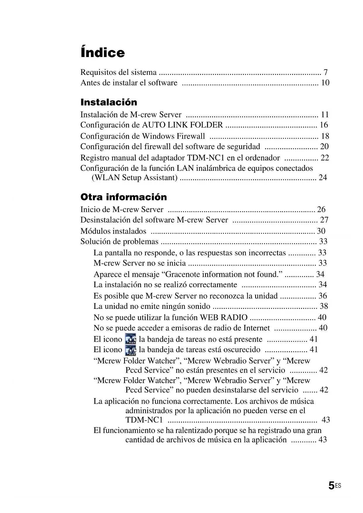 s Sistema operativo: Windows Vista Ultimate, Windows Vista Business, Windows Vista Home Premium, Windows Vista Home Basic, Windows XP Home Edition (SP2 o superior), Windows XP Professional (SP2 o superior), Windows XP Media Center Edition 2004 (SP2 o superior), Windows XP Media Center Edition 2005 (SP2 o superior) M-crew Server no funciona en los entornos Microsoft Windows 3.1, Windows 95, Windows 98, Windows Me, Windows NT, Windows 2000 Professional, Windows XP (anterior a SP2), Windows Vista Starter Edition o Windows Vista Enterprise. Durante la instalación, inicie la sesión como administrador. s Módulo Microsoft .NET Framework versión 2.0 o superior s Acceso a Internet (para acceso Gracenote y WEB RADIO) s Display: XGA (1.024 × 768 píxeles) Debe tener capacidad para visualizar al menos 65.536 colores. s Idioma utilizado: inglés/alemán/francés s Privilegios de usuario – Sólo los usuarios con privilegios de administrador pueden usar M-crew Server. – M-crew Server no permite la función de cambio de usuarios. Notas