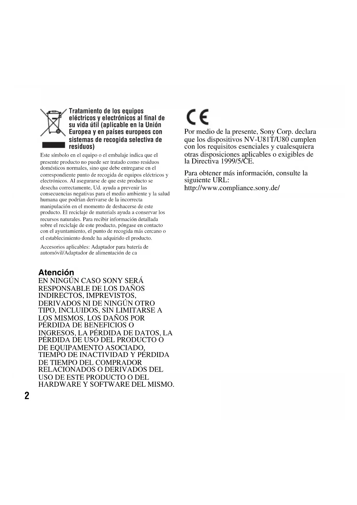 HARDWARE Y SOFTWARE DEL MISMO. Por medio de la presente, Sony Corp. declara que los dispositivos NV-U81T/U80 cumplen con los requisitos esenciales y cualesquiera otras disposiciones aplicables o exigibles de la Directiva 1999/5/CE. Para obtener más información, consulte la siguiente URL: http://www.compliance.sony.de/ Tratamiento de los equipos eléctricos y electrónicos al final de su vida útil (aplicable en la Unión Europea y en países europeos con sistemas de recogida selectiva de residuos) Este símbolo en el equipo o el embalaje indica que el presente producto no puede ser tratado como residuos domésticos normales, sino que debe entregarse en el correspondiente punto de recogida de equipos eléctricos y electrónicos. Al asegurarse de que este producto se desecha correctamente, Ud. ayuda a prevenir las consecuencias negativas para el medio ambiente y la salud humana que podrían derivarse de la incorrecta manipulación en el momento de deshacerse de este producto. El reciclaje de materials ayuda a conservar los recursos naturales. Para recibir información detallada sobre el reciclaje de este producto, póngase en contacto con el ayuntamiento, el punto de recogida más cercano o el establecimiento donde ha adquirido el producto. Accesorios aplicables: Adaptador para batería de automóvil/Adaptador de alimentación de caTabla de contenido