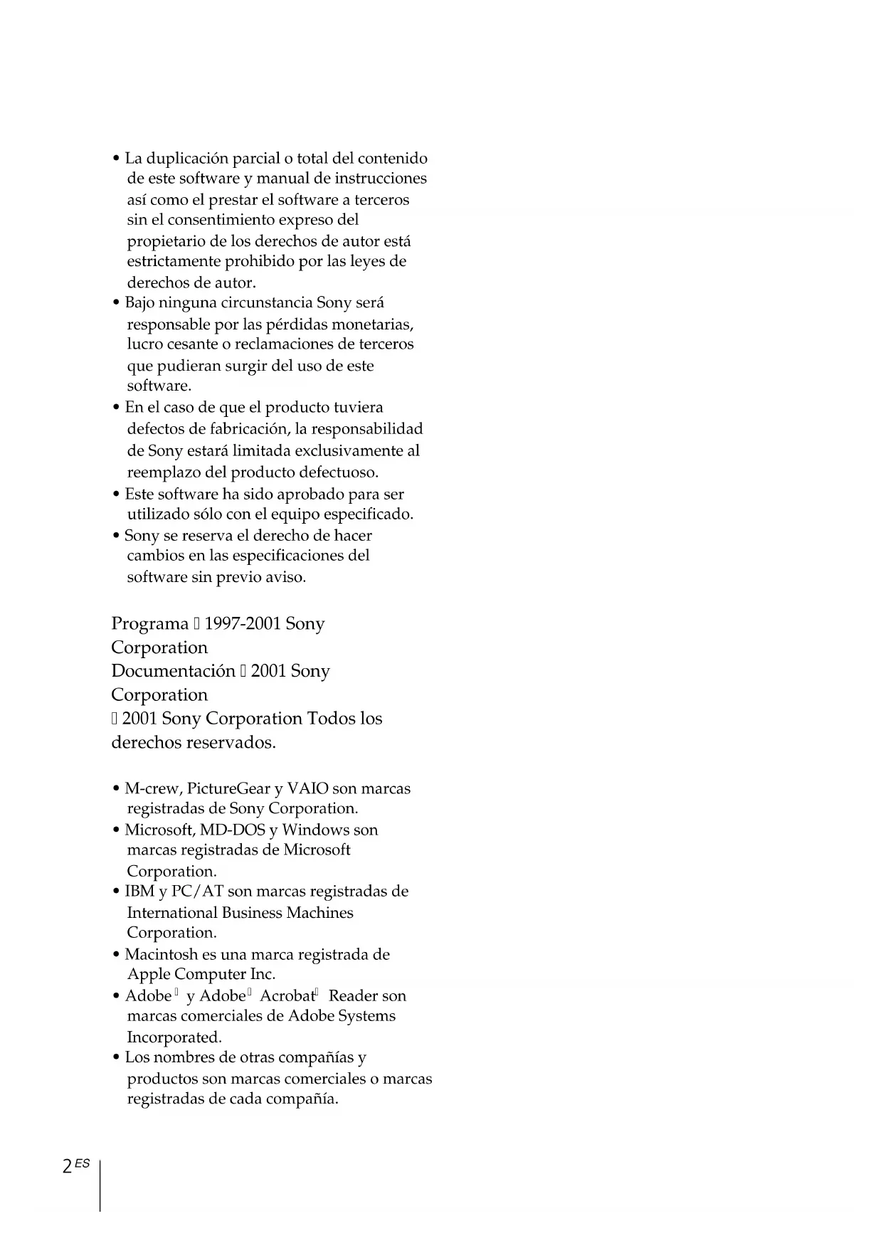 - Sony se reserva el derecho de hacer cambios en las especificaciones del software sin previo aviso. Programa 1997-2001 Sony Corporation Documentación 2001 Sony Corporation 2001 Sony Corporation Todos los derechos reservados.