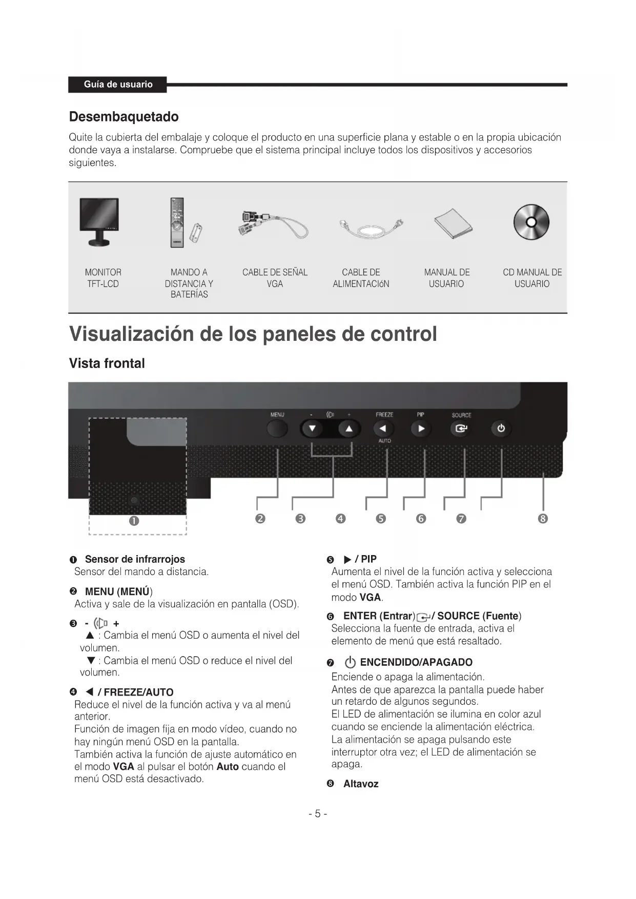 C. MENÚ DE Sonido ................................................................................................... 14 D. MENÚ DE Configuración ....................................................................................... 15 Especificaciones .....................................................................................17 Índice - 4 -Guía de usuario Desembaquetado Quite la cubierta del embalaje y coloque el producto en una superficie plana y estable o en la propia ubicación donde vaya a instalarse. Compruebe que el sistema principal incluye todos los dispositivos y accesorios siguientes. Vista frontal MONITOR TFT-LCD MANDO A DISTANCIA Y BATERÍAS