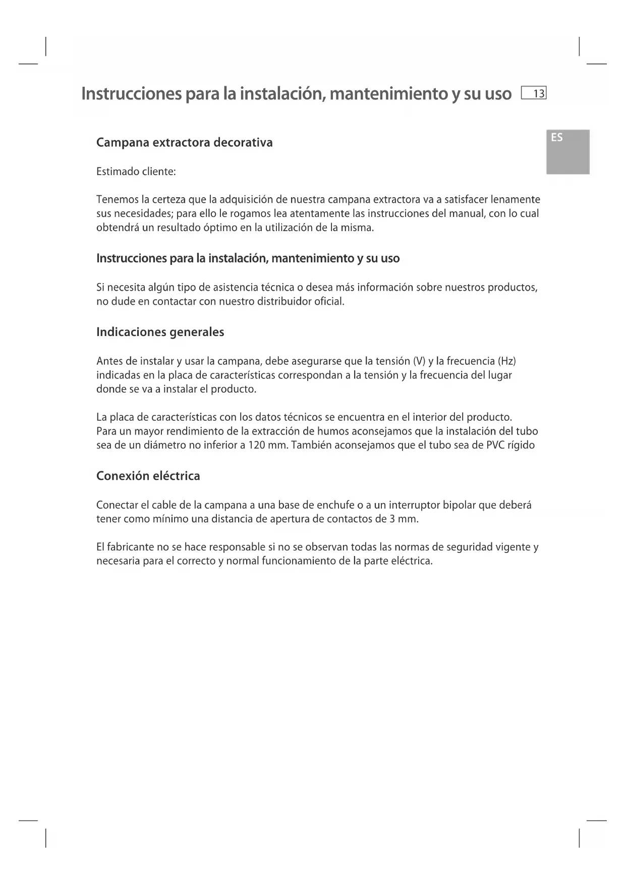 Instrucciones para la instalación, mantenimiento y su uso Campana extractora decorativa Estimado cliente: Tenemos la certeza que la adquisición de nuestra campana extractora va a satisfacer lenamente sus necesidades; para ello le rogamos lea atentamente las instrucciones del manual, con lo cual obtendrá un resultado óptimo en la utilización de la misma. Instrucciones para la instalación, mantenimiento y su uso Si necesita algún tipo de asistencia técnica o desea más información sobre nuestros productos, no dude en contactar con nuestro distribuidor oficial. Indicaciones generales Antes de instalar y usar la campana, debe asegurarse que la tensión (V) y la frecuencia (Hz) indicadas en la placa de características correspondan a la tensión y la frecuencia del lugar donde se va a instalar el producto. La placa de características con los datos técnicos se encuentra en el interior del producto. Para un mayor rendimiento de la extracción de humos aconsejamos que la instalación del tubo sea de un diámetro no inferior a 120 mm. También aconsejamos que el tubo sea de PVC rígido Conexión eléctrica Conectar el cable de la campana a una base de enchufe o a un interruptor bipolar que deberá tener como mínimo una distancia de apertura de contactos de 3 mm. El fabricante no se hace responsable si no se observan todas las normas de seguridad vigente y necesaria para el correcto y normal funcionamiento de la parte eléctrica.14