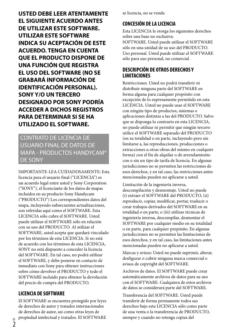 USTED DEBE LEER ATENTAMENTE EL SIGUIENTE ACUERDO ANTES DE UTILIZAR ESTE SOFTWARE. UTILIZAR ESTE SOFTWARE INDICA SU ACEPTACIÓN DE ESTE ACUERDO. TENGA EN CUENTA QUE EL PRODUCTO DISPONE DE UNA FUNCIÓN QUE REGISTRA EL USO DEL SOFTWARE (NO SE GRABARÁ INFORMACIÓN DE IDENTIFICACIÓN PERSONAL). SONY Y/O UN TERCERO DESIGNADO POR SONY PODRÍA ACCEDER A DICHOS REGISTROS PARA DETERMINAR SI SE HA UTILIZADO EL SOFTWARE. CONTRATO DE LICENCIA DE USUARIO FINAL DE DATOS DE MAPA - PRODUCTOS HANDYCAM® DE SONY IMPORTANTE-LEA CUIDADOSAMENTE: Esta licencia para el usuario final (“LICENCIA”) es un acuerdo legal entre usted y Sony Corporation (“SONY”), el licenciante de los datos de mapas incluidos en su producto Sony Handycam (“PRODUCTO”) Los correspondientes datos del mapa, incluyendo subsecuentes actualizaciones, son referidas aquí como el SOFTWARE. Esta LICENCIA sólo cubre el SOFTWARE. Usted puede utilizar el SOFTWARE sólo en relación con su uso del PRODUCTO. Al utilizar el SOFTWARE, usted acepta que quedará vinculado por los términos de esta LICENCIA. Si no está de acuerdo con los términos de esta LICENCIA, SONY no está dispuesto a conceder la licencia del SOFTWARE. En tal caso, no podrá utilizar el SOFTWARE, y debe ponerse en contacto de inmediato con Sony para obtener instrucciones sobre cómo devolver el PRODUCTO y todo el SOFTWARE incluido para obtener la devolución del precio de compra del PRODUCTO.