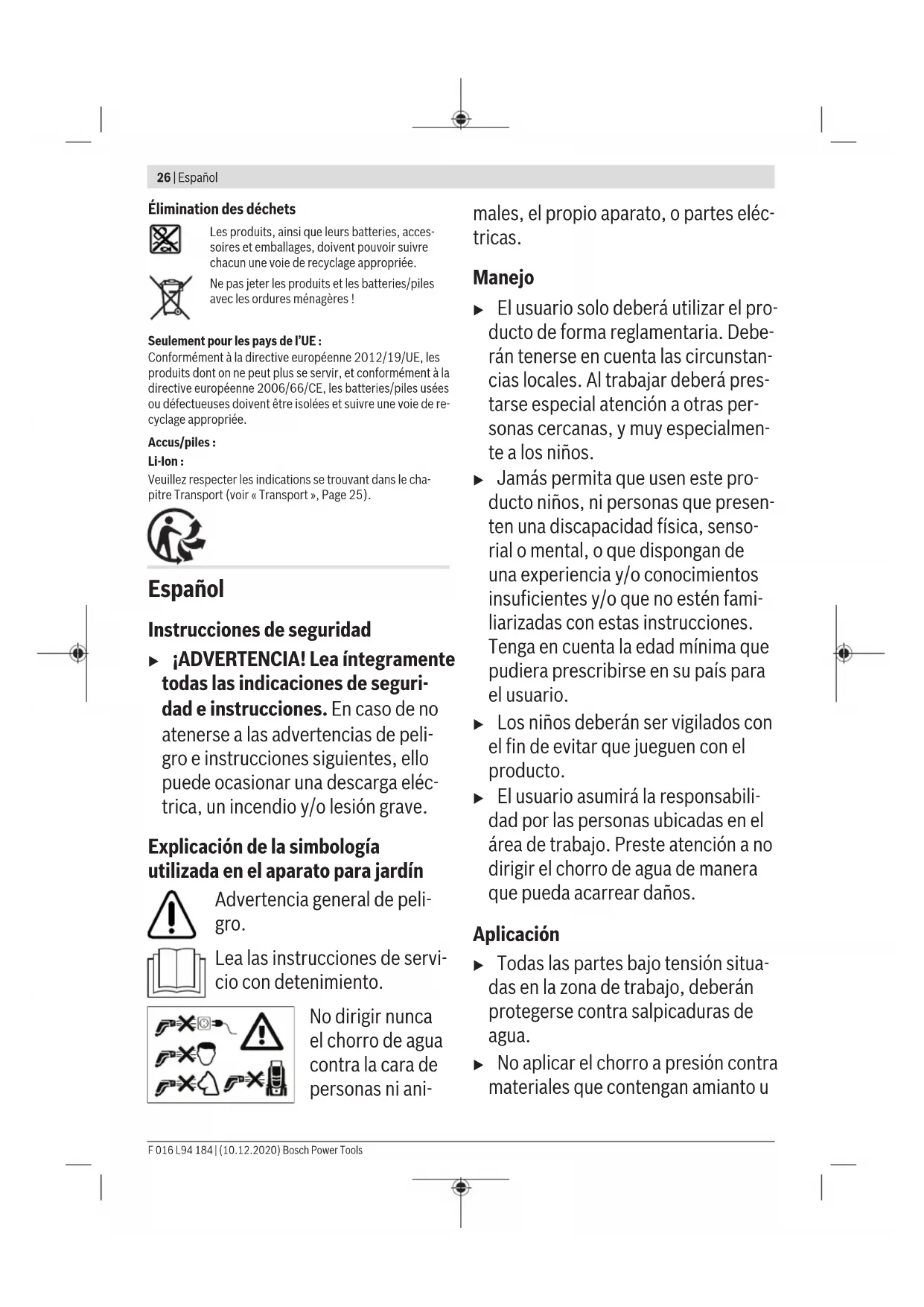 Arrêter l’appareil et appuyer sur la gâchette pour purger l’eau du tuyau. Desserrer le tuyau de la lance et de la sortie d’eau. La lance, la brosse et le tuyau peuvent être stockés sur l’appareil. Purger l’eau du système et sortir la batterie. Nettoyer le filtre régulièrement. Entretien de la batterie Respectez les indications et mesures suivantes qui per- mettent une utilisation optimale de la batterie: – Protégez la batterie de l’humidité et de l’eau. – Ne rangez l’outil de jardin et la batterie qu’à une plage de température entre -20°C et 50°C. Ne laissez pas la batte- rie p. ex. dans une voiture en été. – Rangez la batterie séparément et non dans l’outil de jar- din. – Ne laissez pas la batterie dans l’outil de jardin en cas d’ex- position directe au soleil. – La température optimale de stockage de la batterie est de 5°C. – Nettoyez de temps en temps les orifices de ventilation de la batterie à l’aide d’un pinceau doux, propre et sec. Si l’autonomie de la batterie diminue considérablement après qu’une recharge a été effectuée, c’est que la batterie est usagée et qu’elle doit être remplacée. Service après-vente et conseil utilisateurs Notre Service après-vente répond à vos questions concer- nant la réparation et l’entretien de votre produit et les pièces de rechange. Vous trouverez des vues éclatées et des infor- mations sur les pièces de rechange sur le site : www.bosch-pt.com L’équipe de conseil utilisateurs Bosch se tient à votre dispo- sition pour répondre à vos questions concernant nos pro- duits et leurs accessoires. Pour toute demande de renseignement ou toute commande de pièces de rechange, précisez impérativement la réfé- rence à 10chiffres figurant sur l’étiquette signalétique du produit. France Réparer un outil Bosch n’a jamais été aussi simple, et ce, en moins de 5 jours, grâce à SAV DIRECT, notre formulaire de retour en ligne que vous trouverez sur notre site internet www.bosch-pt.fr à la rubrique Services. Vous y trouverez également notre boutique de pièces détachées en ligne où vous pouvez passer directement vos commandes. Vous êtes un utilisateur, contactez : Le Service Clientèle Bosch Outillage Electroportatif Tel.: 0970821299 (Numéro non surtaxé au prix d'un ap- pel local) E-Mail : sav.outillage-electroportatif@fr.bosch.com Vous êtes un revendeur, contactez : Robert Bosch (France) S.A.S. Service Après-Vente Electroportatif 126, rue de Stalingrad 93705 DRANCY Cédex Tel. : (01) 43119006 E-Mail : sav-bosch.outillage@fr.bosch.com Vous trouverez d'autres adresses du service après-vente sous: www.bosch-pt.com/serviceaddresses Transport Les accus Lithium-ion sont soumis à la réglementation rela- tive au transport de matières dangereuses. Pour le transport par voie routière, aucune mesure supplémentaire n’a besoin d’être prise. Lors d’une expédition par un tiers (parex.transport aérien ou entreprise de transport), des mesures spécifiques doivent être prises concernant l’emballage et le marquage. Pour la préparation de l’envoi, faites-vous conseiller par un expert en transport de matières dangereuses. N’expédiez que des accus dont le boîtier n’est pas endom- magé. Recouvrez les contacts non protégés et emballez l’ac- cu de manière à ce qu’il ne puisse pas se déplacer dans l’em- ballage. Veuillez également respecter les réglementations supplémentaires éventuellement en vigueur. Bosch Power Tools F 016 L94 184 | (10.12.2020)26 | Español Élimination des déchets Les produits, ainsi que leurs batteries, acces- soires et emballages, doivent pouvoir suivre chacun une voie de recyclage appropriée. Ne pas jeter les produits et les batteries/piles avec les ordures ménagères ! Seulement pour les pays de l’UE: Conformément à la directive européenne 2012/19/UE, les produits dont on ne peut plus se servir, et conformément à la directive européenne 2006/66/CE, les batteries/piles usées ou défectueuses doivent être isolées et suivre une voie de re- cyclage appropriée. Accus/piles : Li-Ion : Veuillez respecter les indications se trouvant dans le cha- pitre Transport (voir «Transport», Page25). Español Instrucciones de seguridad u ¡ADVERTENCIA! Lea íntegramente todas las indicaciones de seguri- dad e instrucciones. En caso de no atenerse a las advertencias de peli- gro e instrucciones siguientes, ello puede ocasionar una descarga eléc- trica, un incendio y/o lesión grave. Explicación de la simbología utilizada en el aparato para jardín Advertencia general de peli- gro. Lea las instrucciones de servi- cio con detenimiento. No dirigir nunca el chorro de agua contra la cara de personas ni ani- males, el propio aparato, o partes eléc- tricas. Manejo u El usuario solo deberá utilizar el pro- ducto de forma reglamentaria. Debe- rán tenerse en cuenta las circunstan- cias locales. Al trabajar deberá pres- tarse especial atención a otras per- sonas cercanas, y muy especialmen- te a los niños. u Jamás permita que usen este pro- ducto niños, ni personas que presen- ten una discapacidad física, senso- rial o mental, o que dispongan de una experiencia y/o conocimientos insuficientes y/o que no estén fami- liarizadas con estas instrucciones. Tenga en cuenta la edad mínima que pudiera prescribirse en su país para el usuario. u Los niños deberán ser vigilados con el fin de evitar que jueguen con el producto. u El usuario asumirá la responsabili- dad por las personas ubicadas en el área de trabajo. Preste atención a no dirigir el chorro de agua de manera que pueda acarrear daños. Aplicación u Todas las partes bajo tensión situa- das en la zona de trabajo, deberán protegerse contra salpicaduras de agua. u No aplicar el chorro a presión contra materiales que contengan amianto u F 016 L94 184 | (10.12.2020) Bosch Power ToolsEspañol | 27 otros materiales nocivos para la sa- lud. u Solo deje funcion