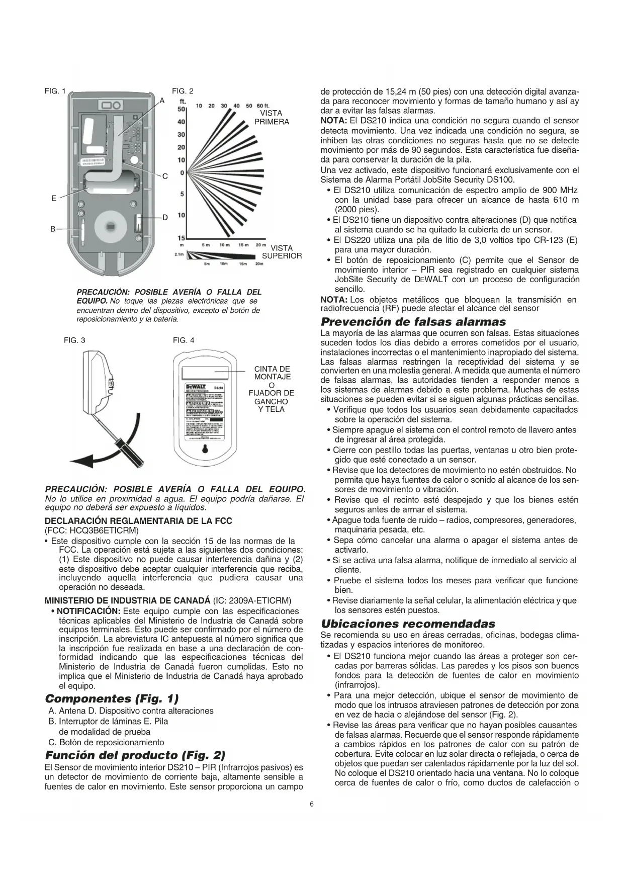 - NOTIFICACIÓN: Este equipo cumple con las especificaciones técnicas aplicables del Ministerio de Industria de Canadá sobre equipos terminales. Esto puede ser confirmado por el número de inscripción. La abreviatura IC antepuesta al número significa que la inscripción fue realizada en base a una declaración de con- formidad indicando que las especificaciones técnicas del Ministerio de Industria de Canadá fueron cumplidas. Esto no implica que el Ministerio de Industria de Canadá haya aprobado el equipo. Componentes (Fig. 1) A. Antena D. Dispositivo contra alteraciones B. Interruptor de láminas E. Pila de modalidad de prueba C. Botón de reposicionamiento Función del producto (Fig. 2) El Sensor de movimiento interior DS210 – PIR (Infrarrojos pasivos) es un detector de movimiento de corriente baja, altamente sensible a fuentes de calor en movimiento. Este sensor proporciona un campo de protección de 15,24 m (50 pies) con una detección digital avanza- da para reconocer movimiento y formas de tamaño humano y así ay dar a evitar las falsas alarmas. NOTA: El DS210 indica una condición no segura cuando el sensor detecta movimiento. Una vez indicada una condición no segura, se inhiben las otras condiciones no seguras hasta que no se detecte movimiento por más de 90 segundos. Esta característica fue diseña- da para conservar la duración de la pila. Una vez activado, este dispositivo funcionará exclusivamente con el Sistema de Alarma Portátil JobSite Security DS100.