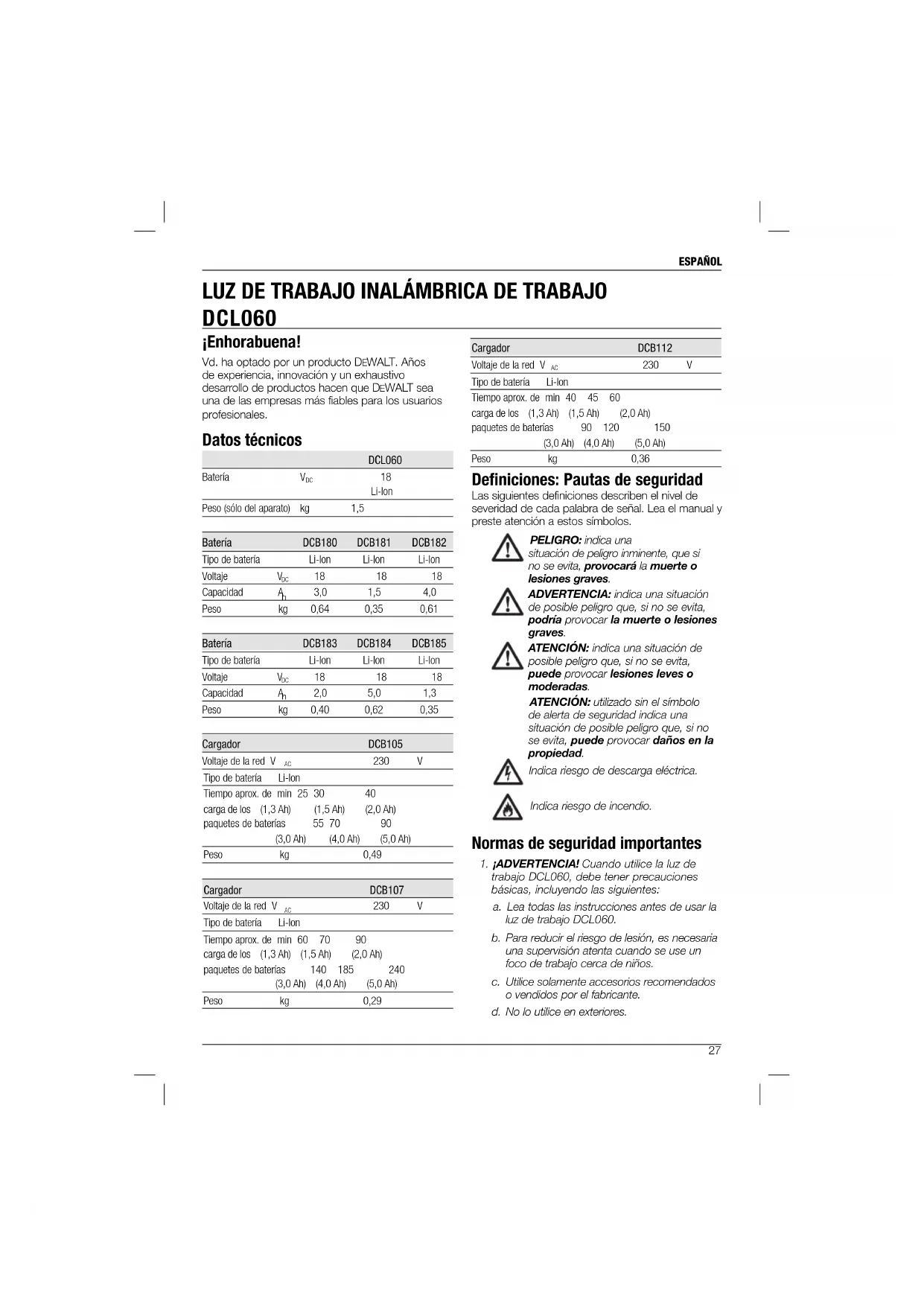 230 V Tipo de batería Li-Ion Tiempo aprox. de min 40 45 60 carga de los (1,3 Ah) (1,5 Ah) (2,0 Ah) paquetes de baterías 90 120 150 (3,0 Ah) (4,0 Ah) (5,0 Ah) Peso kg 0,36 Defi niciones: Pautas de seguridad Las siguientes definiciones describen el nivel de severidad de cada palabra de señal. Lea el manual y preste atención a estos símbolos. PELIGRO: indica una situación de peligro inminente, que si no se evita, provocará la muerte o lesiones graves. ADVERTENCIA: indica una situación de posible peligro que, si no se evita, podría provocar la muerte o lesiones graves. ATENCIÓN: indica una situación de posible peligro que, si no se evita, puede provocar lesiones leves o moderadas. ATENCIÓN: utilizado sin el símbolo de alerta de seguridad indica una situación de posible peligro que, si no se evita, puede provocar daños en la propiedad. Indica riesgo de descarga eléctrica. Indica riesgo de incendio. Normas de seguridad importantes