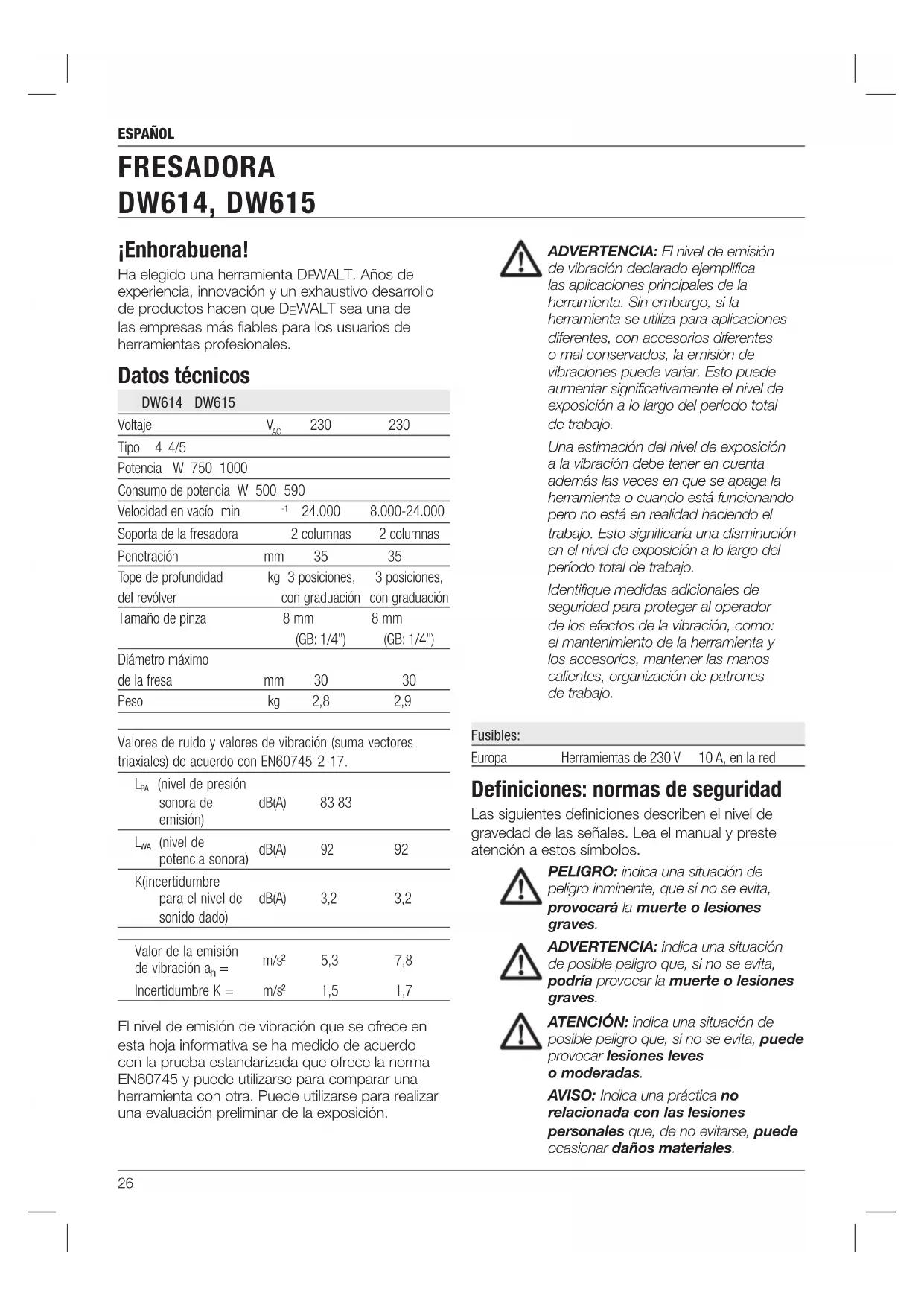 WALT sea una de las empresas más fiables para los usuarios de herramientas profesionales. Datos técnicos DW614 DW615 Voltaje V