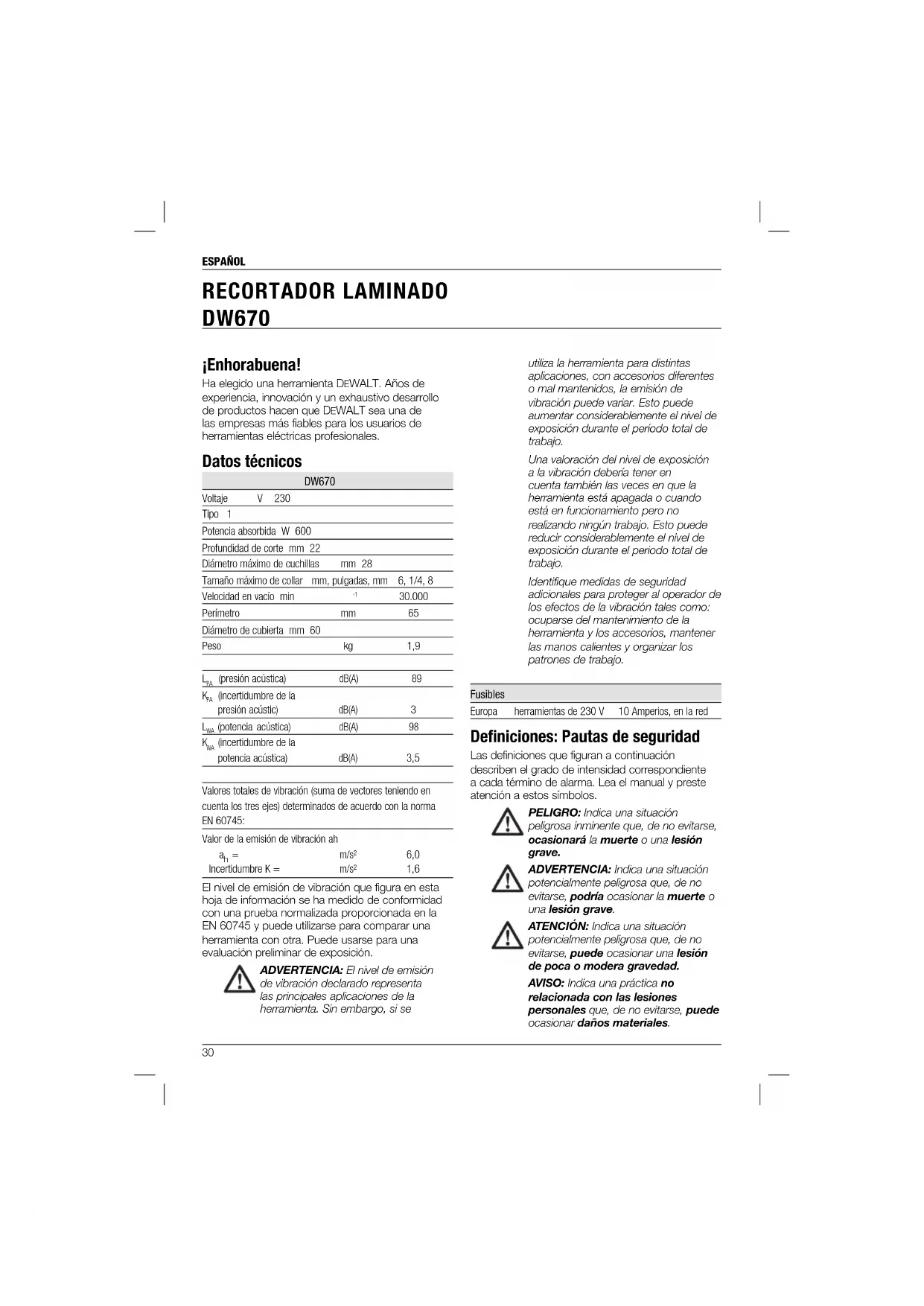 RECORTADOR LAMINADO DW670 ¡Enhorabuena! Ha elegido una herramienta DEWALT. Años de experiencia, innovación y un exhaustivo desarrollo de productos hacen que DEWALT sea una de las empresas más fiables para los usuarios de herramientas eléctricas profesionales. Datos técnicos DW670 Voltaje V 230 Tipo 1 Potencia absorbida W 600 Profundidad de corte mm 22 Diámetro máximo de cuchillas mm 28 Tamaño máximo de collar mm, pulgadas, mm 6, 1/4, 8 Velocidad en vacío min