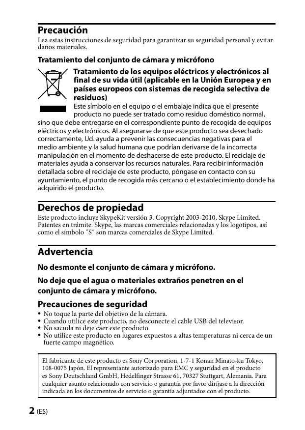 Lea estas instrucciones de seguridad para garantizar su seguridad personal y evitar daños materiales. Tratamiento del conjunto de cámara y micrófono Tratamiento de los equipos eléctricos y electrónicos al final de su vida útil (aplicable en la Unión Europea y en países europeos con sistemas de recogida selectiva de residuos) Este símbolo en el equipo o el embalaje indica que el presente producto no puede ser tratado como residuo doméstico normal, sino que debe entregarse en el correspondiente punto de recogida de equipos eléctricos y electrónicos. Al asegurarse de que este producto sea desechado correctamente, Ud. ayuda a prevenir las consecuencias negativas para el medio ambiente y la salud humana que podrían derivarse de la incorrecta manipulación en el momento de deshacerse de este producto. El reciclaje de materiales ayuda a conservar los recursos naturales. Para recibir información detallada sobre el reciclaje de este producto, póngase en contacto con su ayuntamiento, el punto de recogida más cercano o el establecimiento donde ha adquirido el producto. Derechos de propiedad Este producto incluye SkypeKit versión 3. Copyright 2003-2010, Skype Limited. Patentes en trámite. Skype, las marcas comerciales relacionadas y los logotipos, así como el símbolo ˝S˝ son marcas comerciales de Skype Limited. Advertencia No desmonte el conjunto de cámara y micrófono. No deje que el agua o materiales extraños penetren en el conjunto de cámara y micrófono. Precauciones de seguridad