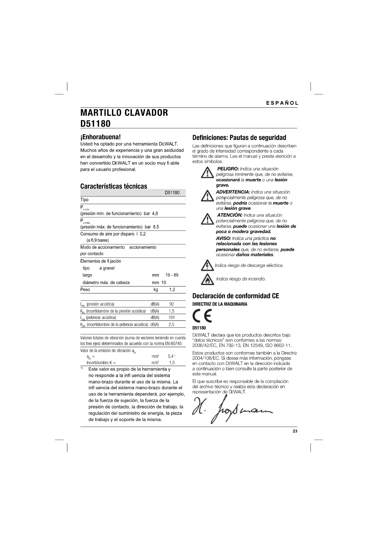 D51180 DEWALT declara que los productos descritos bajo “datos técnicos” son conformes a las normas: 2006/42/EC, EN 792-13, EN 12549, ISO 8662-11. Estos productos son conformes también a la Directriz 2004/108/EC. Si desea más información, póngase en contacto con DEWALT en la dirección indicada a continuación o bien consulte la parte posterior de este manual. El que suscribe es responsable de la compilación del archivo técnico y realiza esta declaración en representación de D EWALT.24 ESPAÑOL Horst Grossmann Vicepresidente de Ingeniería y Desarrollo de Productos DEWALT, Richard-Klinger-Straße 11, D-65510, Idstein, Alemania