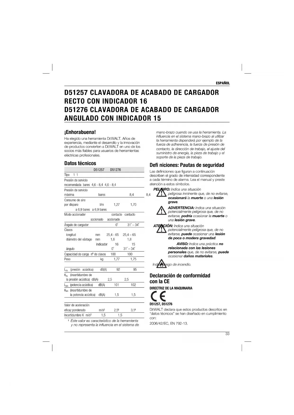 EWALT declara que estos productos descritos en “datos técnicos” se han diseñado en cumplimiento con: 2006/42/EC, EN 792-13. ¡Enhorabuena! Ha elegido una herramienta DEWALT. Años de experiencia, mediante el desarrollo y la innovación de productos convierten a DEWALT en uno de los socios más fiables para usuarios de herramientas eléctricas profesionales. Datos técnicos D51257 D51276 Tipo 1 1 Presión de servicio recomendada bares 4,6 - 8,4 4,6 - 8,4 Presión de servicio máxima bares 8,4 8,4 Consumo de aire por disparo l/m 1,27 1,70 a 6,9 bares a 6,9 bares Modo accionador contacto contacto accionado accionado Ángulo de cargador 0˚ 31˚ – 34˚ Clavos longitud mm 25,4 - 65 25,4 – 65 diámetro del vástago mm 1,6 1,8 indicador 16 15 ángulo 0˚ 31˚ – 34˚ Capacidad de carga nº de clavos 100 100 Peso kg 1,77 1,75