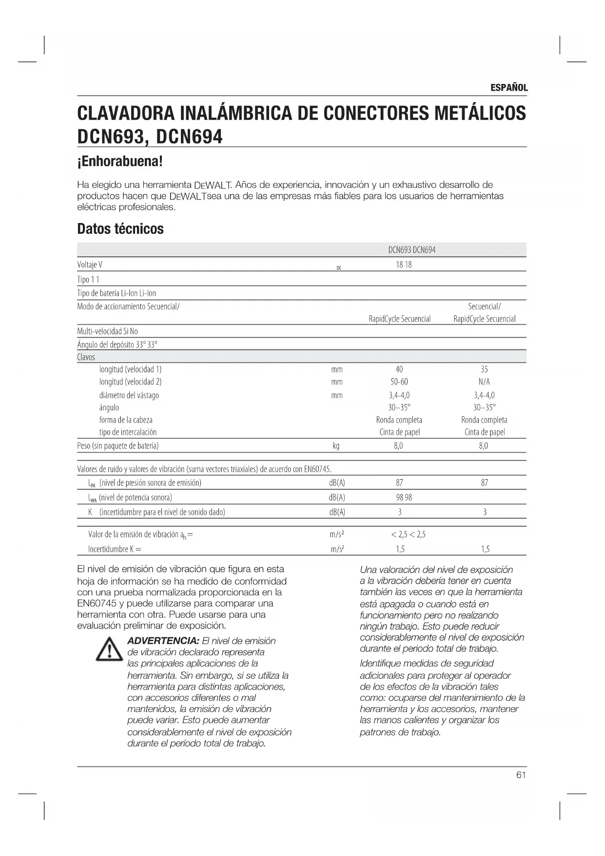 1,5 1,5 CLAVADORA INALÁMBRICA DE CONECTORES METÁLICOS DCN693, DCN694 ¡Enhorabuena! Español (traducido de las instrucciones originales) Una valoración del nivel de exposición a la vibración debería tener en cuenta también las veces en que la herramienta está apagada o cuando está en funcionamiento pero no realizando ningún trabajo. Esto puede reducir considerablemente el nivel de exposición durante el periodo total de trabajo. Identifique medidas de seguridad adicionales para proteger al operador de los efectos de la vibración tales como: ocuparse del mantenimiento de la herramienta y los accesorios, mantener las manos calientes y organizar los patrones de trabajo.62 español Cargador DCB115 Tiempo aprox. de carga de los paquetes de baterías min 22 (1.3 Ah) 22 (1.5 Ah) 30 (2.0 Ah) 45 (3.0 Ah) 60 (4.0 Ah) 75 (5.0 Ah) Peso kg 0,5 Fusibles: Europa Herramientas de 230 V 10 A, en la red Definiciones: normas de seguridad Las siguientes definiciones describen el nivel de gravedad de las señales. Lea el manual y preste atención a estos símbolos. PELIGRO: indica una situación de peligro inminente, que si no se evita, provocará la muerte o lesiones graves. ADVERTENCIA: indica una situación de posible peligro que, si no se evita, podría provocar la muerte o lesiones graves. ATENCIÓN: indica una situación de posible peligro que, si no se evita, puede provocar lesiones leves o moderadas. AVISO: Indica una práctica no relacionada con las lesiones personales que, de no evitarse, puede ocasionar daños materiales. Indica riesgo de descarga eléctrica. Indica riesgo de incendio. Declaración de conformidad CE